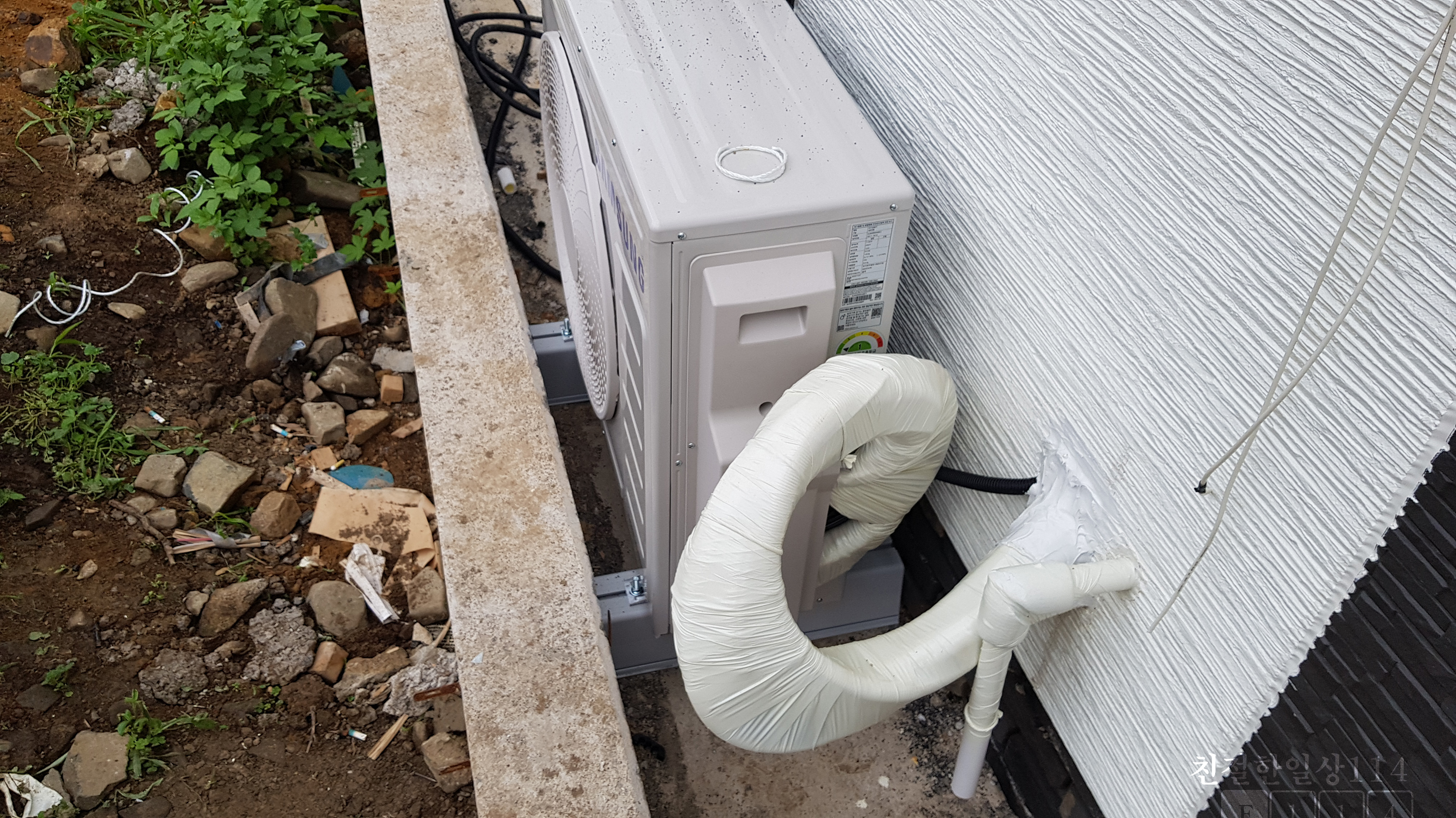 전기선과 물빠지는 호스, 냉매관까지 에어컨이 가동되는데 필요한 배관/배선이 많다. 그리고 물이 빠지는 호스는 경사지게 구배를 잡아줘서 물이 흘러내려 빠져나가도록 해야한다.