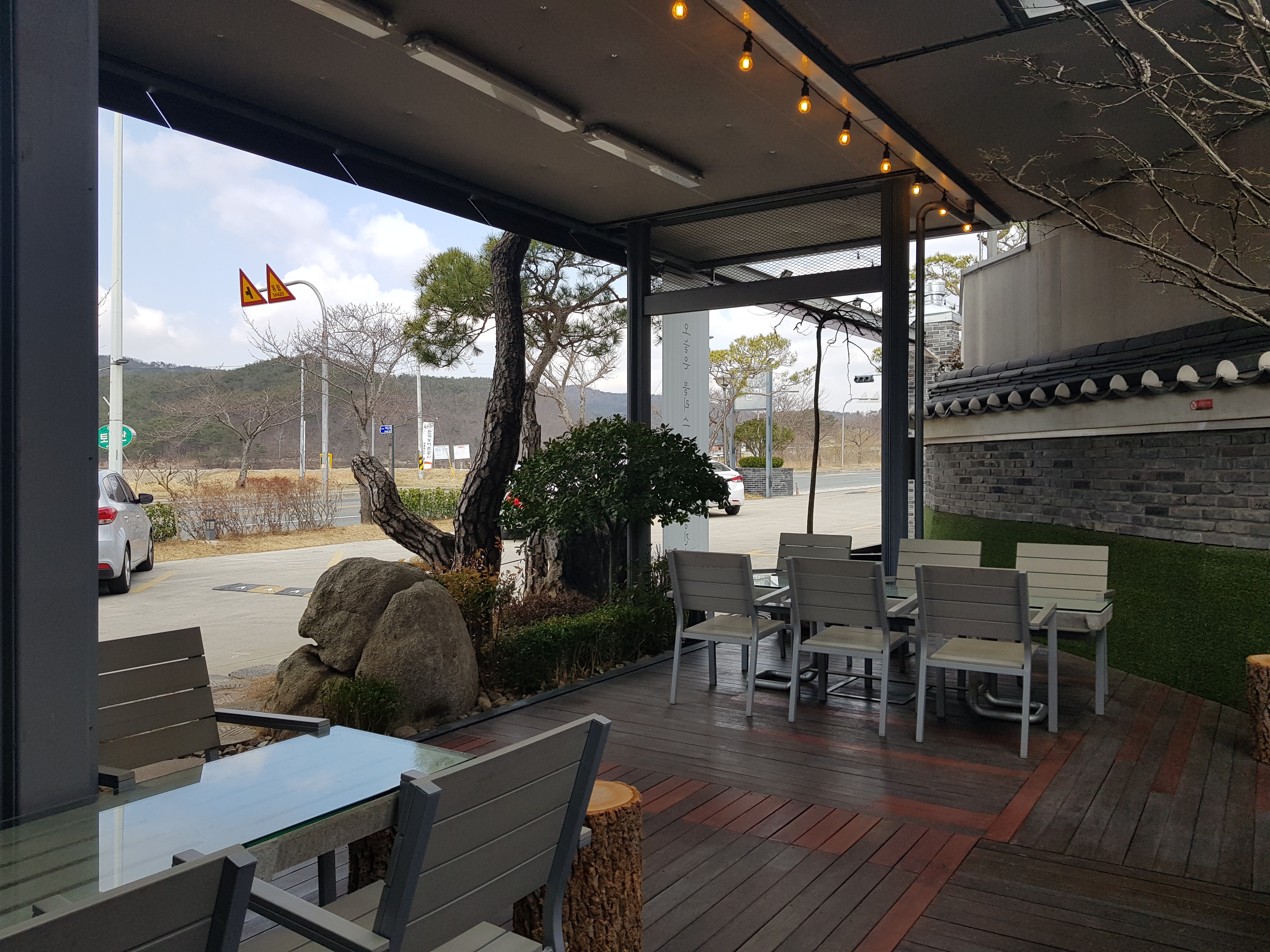 한쪽 끝편에 있는 야외 테라스. 이 공간은 어린이 안전을 위해서 노키즈존으로 운영된다.