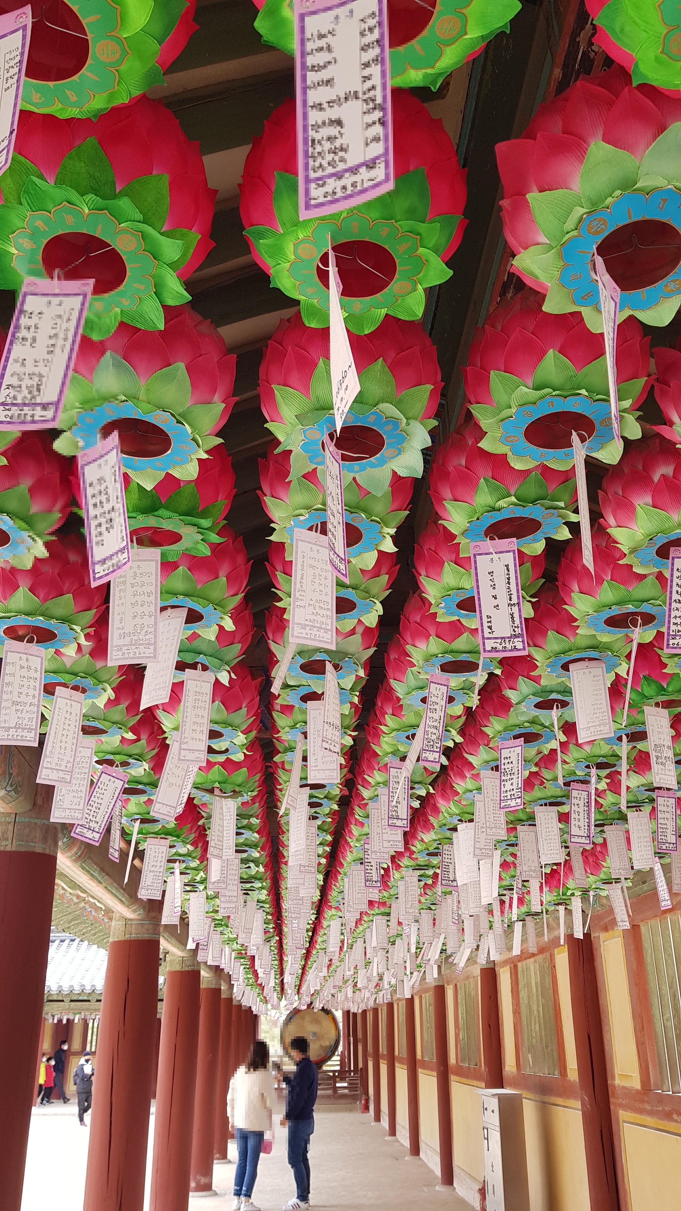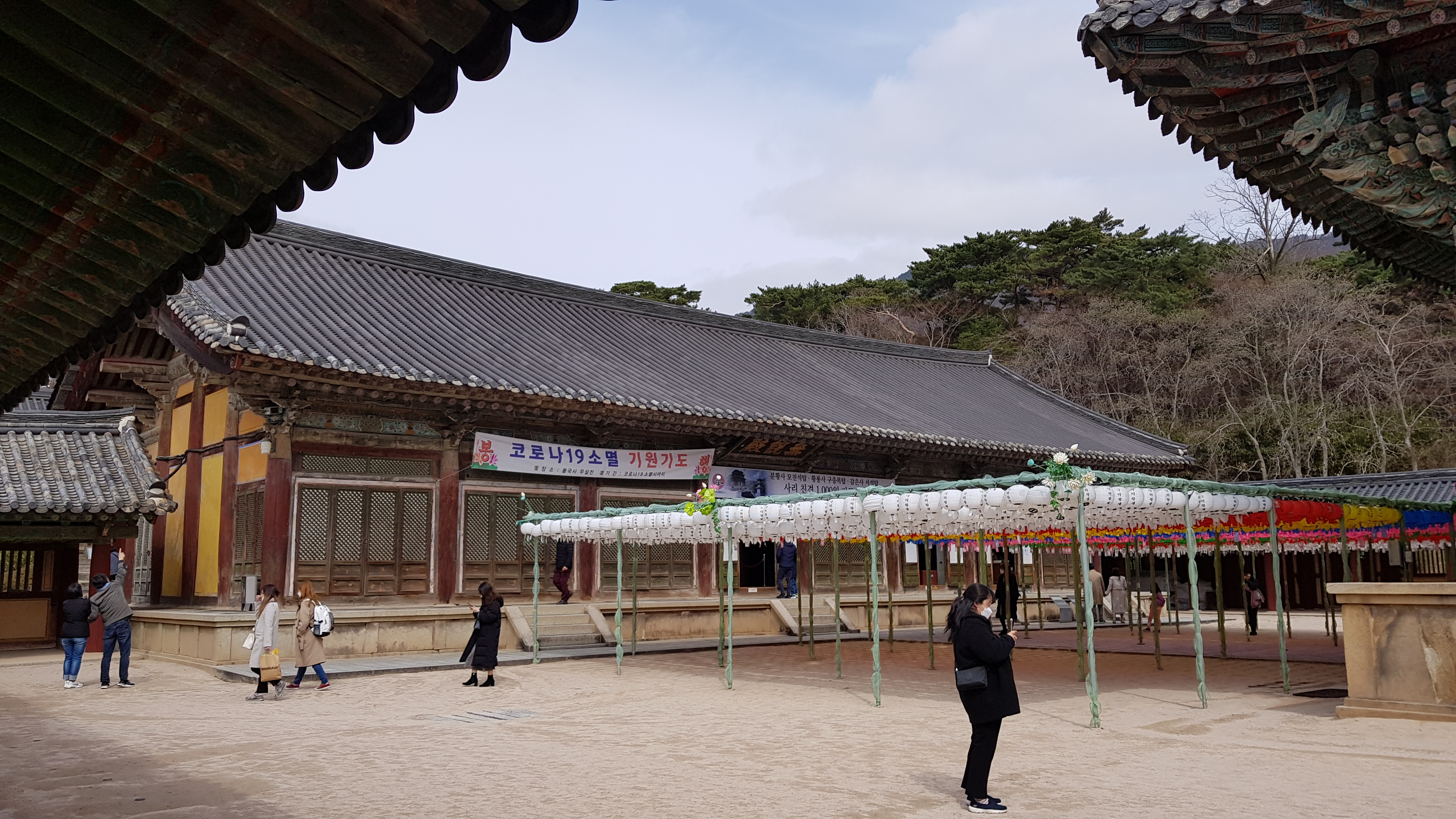 대웅전 뒤쪽으로 코로나19 소멸 기원 등이 걸려있다.