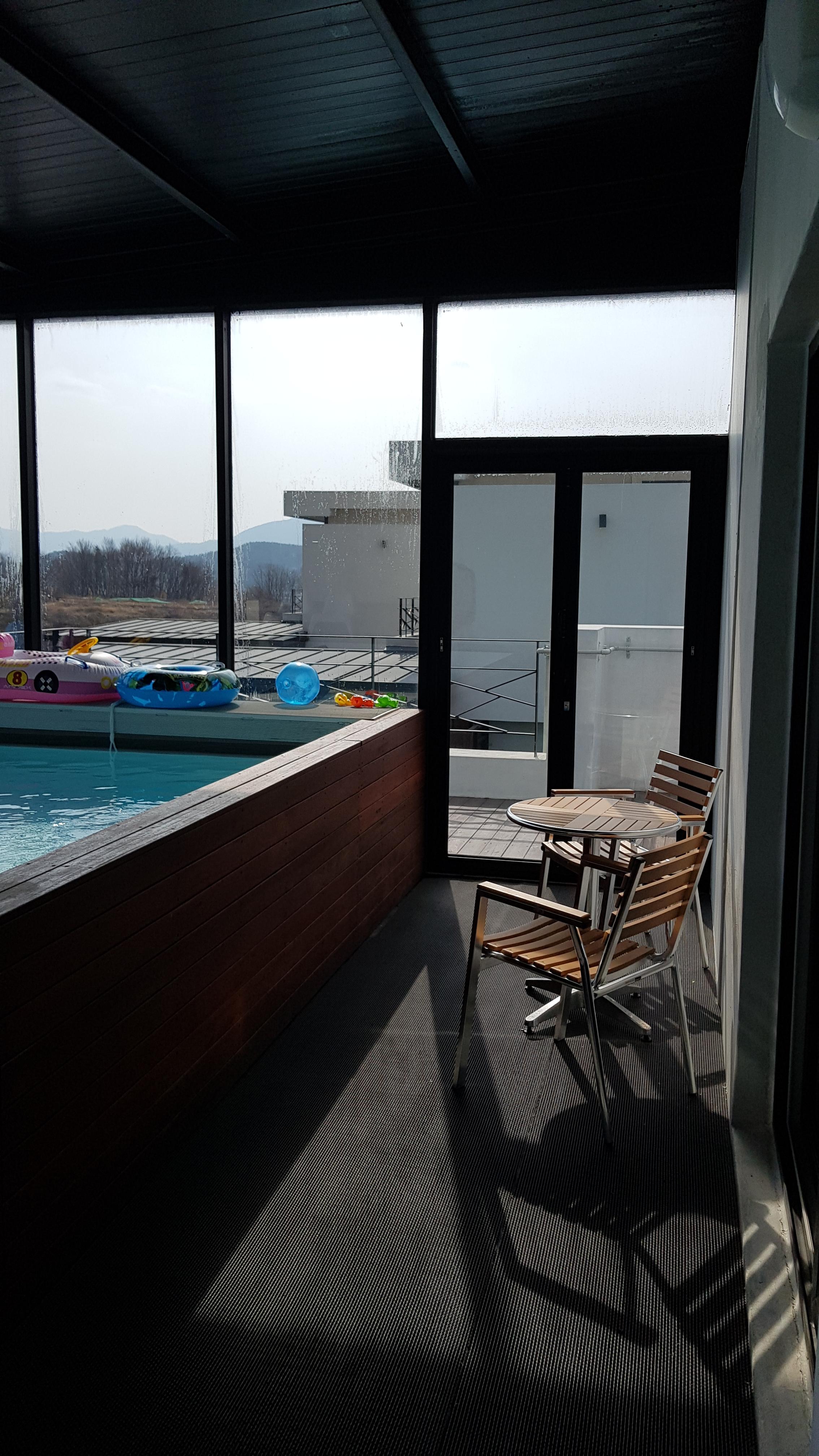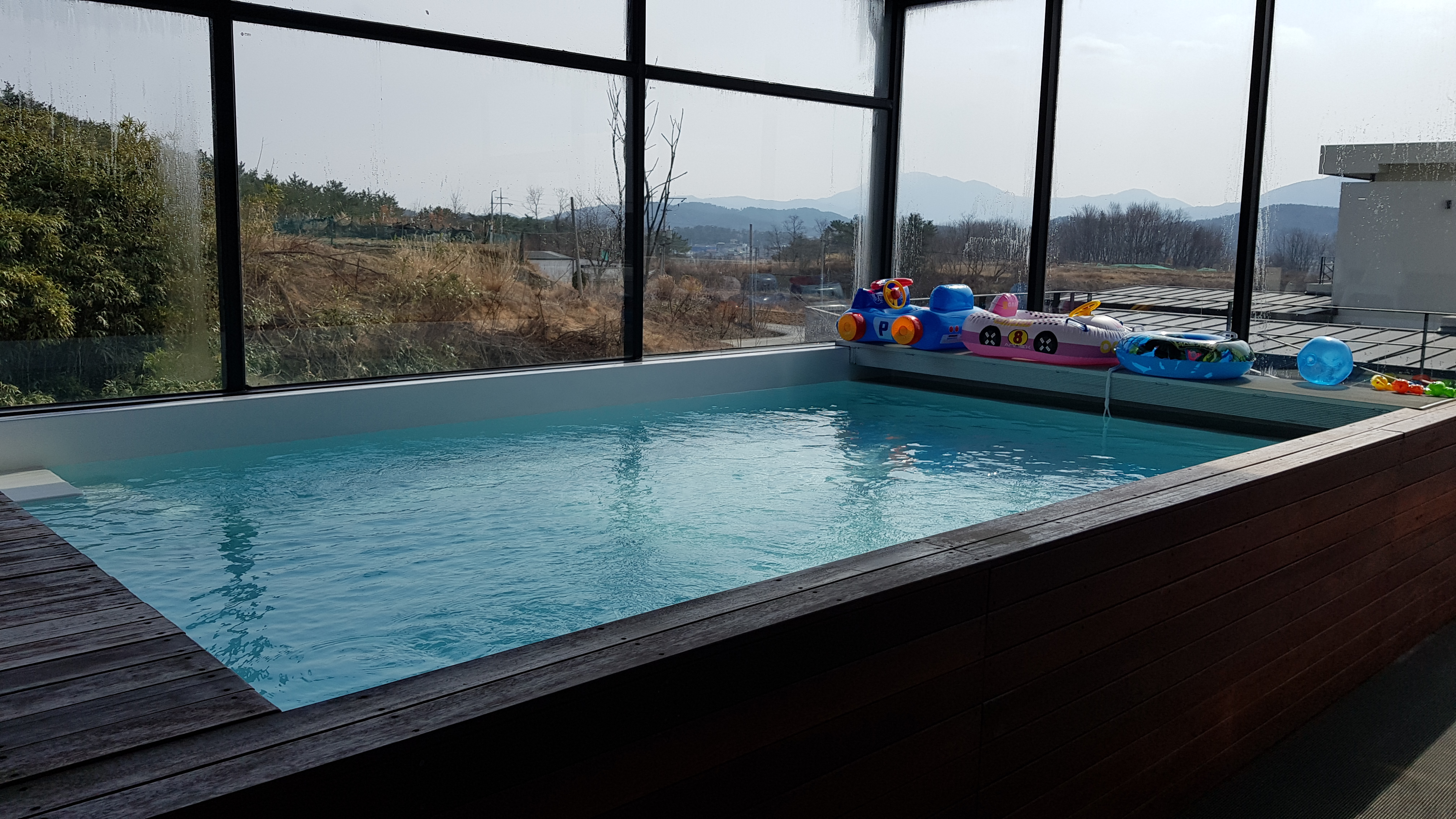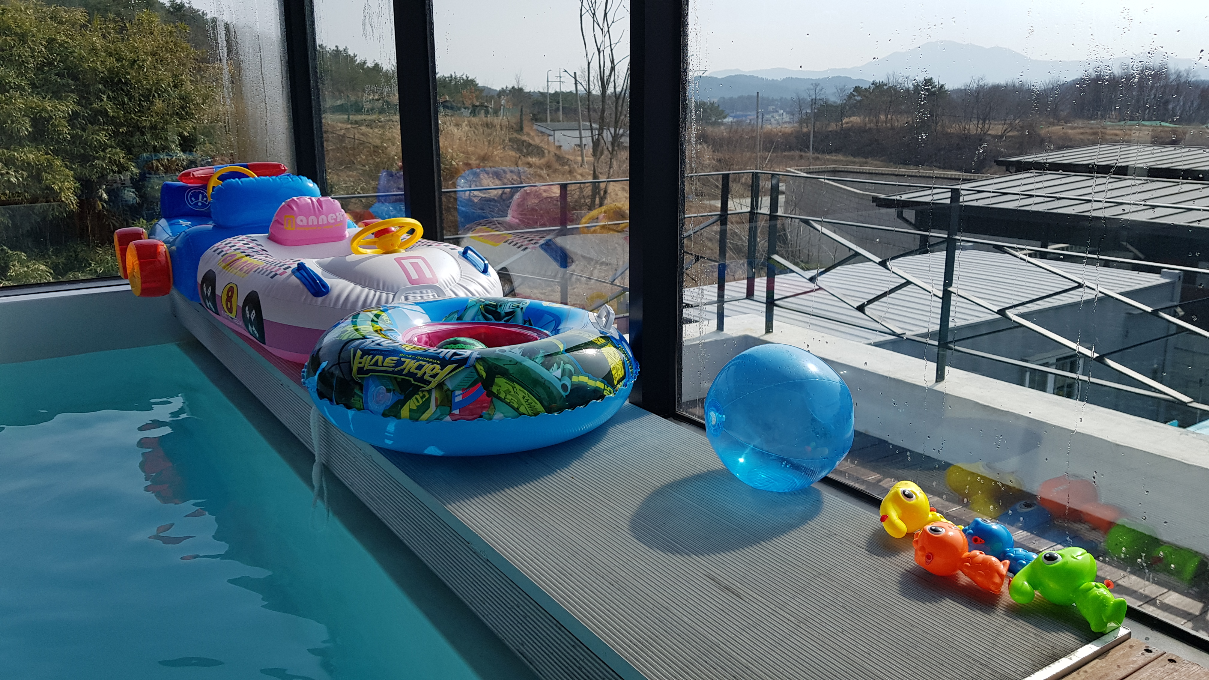 수영장은 2층 패밀리룸과 마주보고 있다. 문을 열고 들어가자 공기가 훈훈하다. 이날은 약간 흐려 햇볕이 들지 않았는데 날씨가 좋으면 더 따뜻할것 같다. 아이들이 수영하다 물밖에 나와서도 춥지 않아서 좋았다. 그리고 수영장문과 2층 화장실 문이 마주보고 있어서 수영을하고 바로 화장실로 가서 씻을 수있는 점도 좋았다.