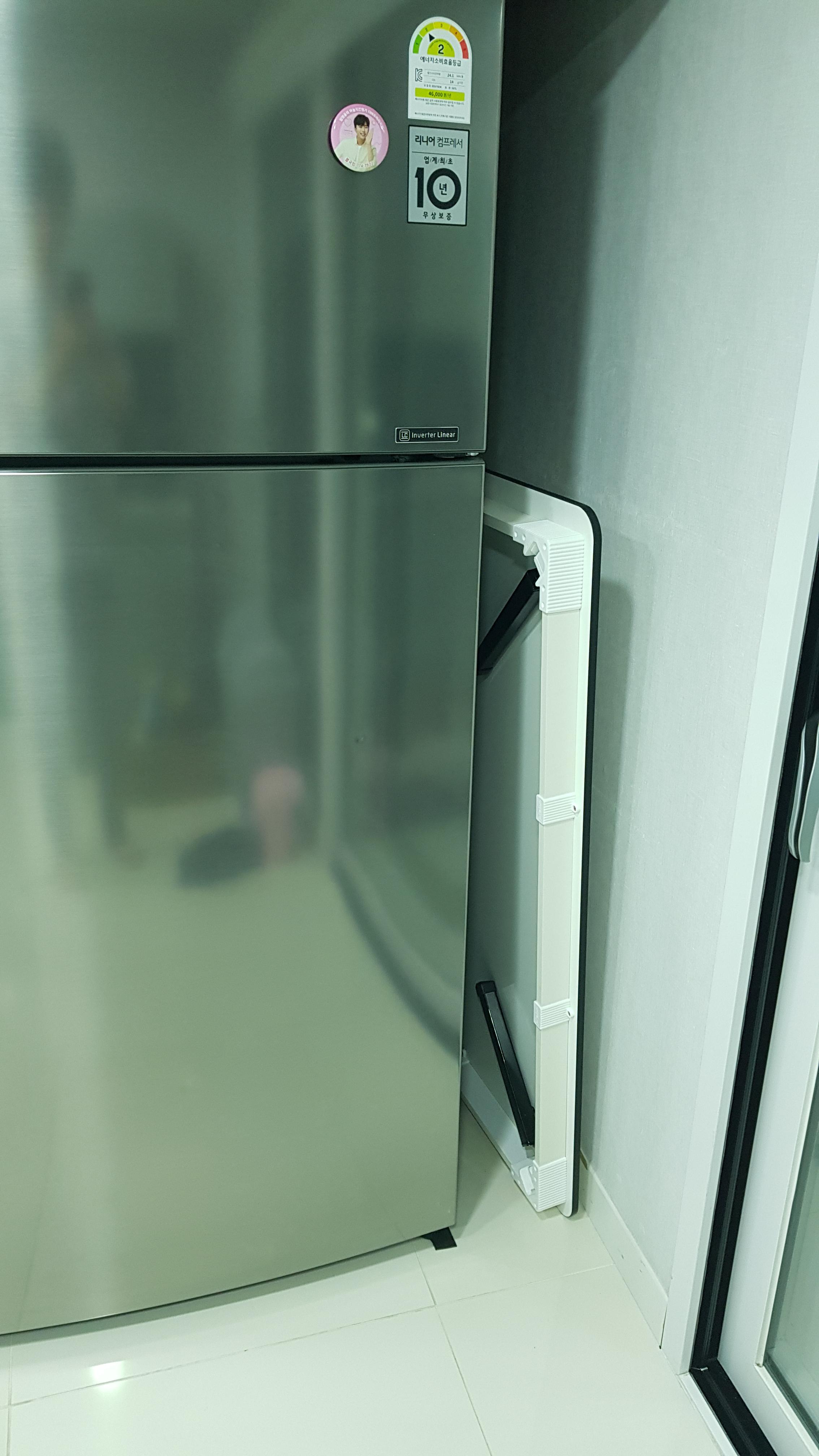 냉장고옆에 접이식 테이블이 2개가 있다. (하나는 펼쳐서 사용중)