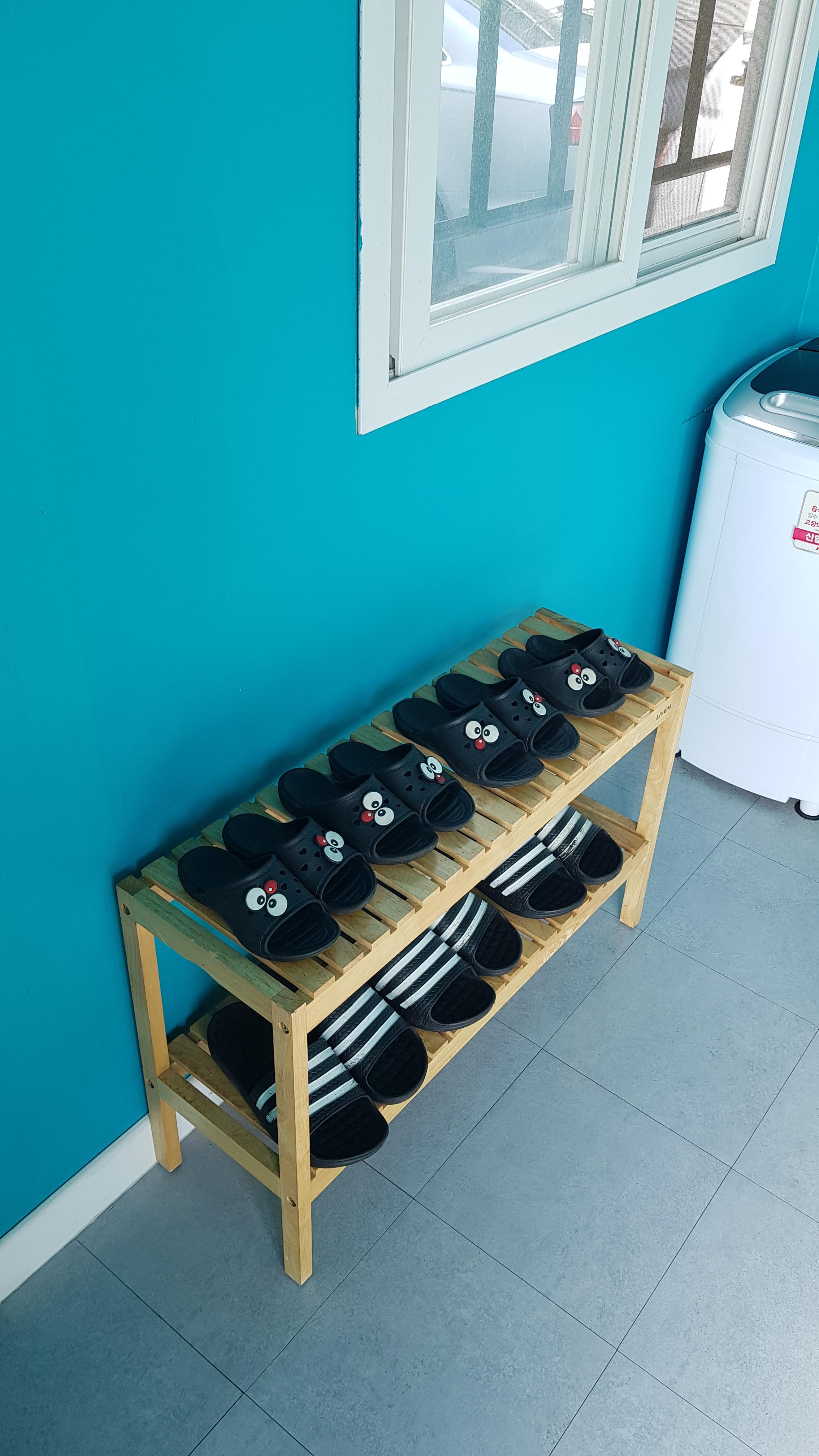 탈수기 옆에 슬리퍼가 있어서 다이닝룸과 데크로 나갈때 사용할 수 있다.