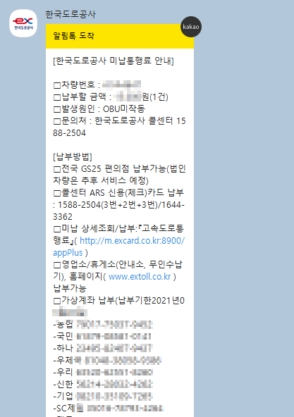1번 온라인 홈페이지에서 납부가 되지 않아서 고객센터 1588-2504로 전화를 걸었다. 필자는 통행권 진입 / 하이패스 진출 미납의 경우이다. 이렇게 통행권 발행 차로 진입, 하이패스 차로 진출한 경우 전산에 조회 되지않아 가장 먼거리 요금이 책정된다고 한다. 아차 싶었지만 다행히도 진입 / 진출 전산기록이 확인이 되어 가상계좌를 카톡으로 받아 납부 할 수 있었다. 최장거리 요금 적용되는 사례와 소명에 관해서는 아래에 내용을 남겨보도록 하겠다.