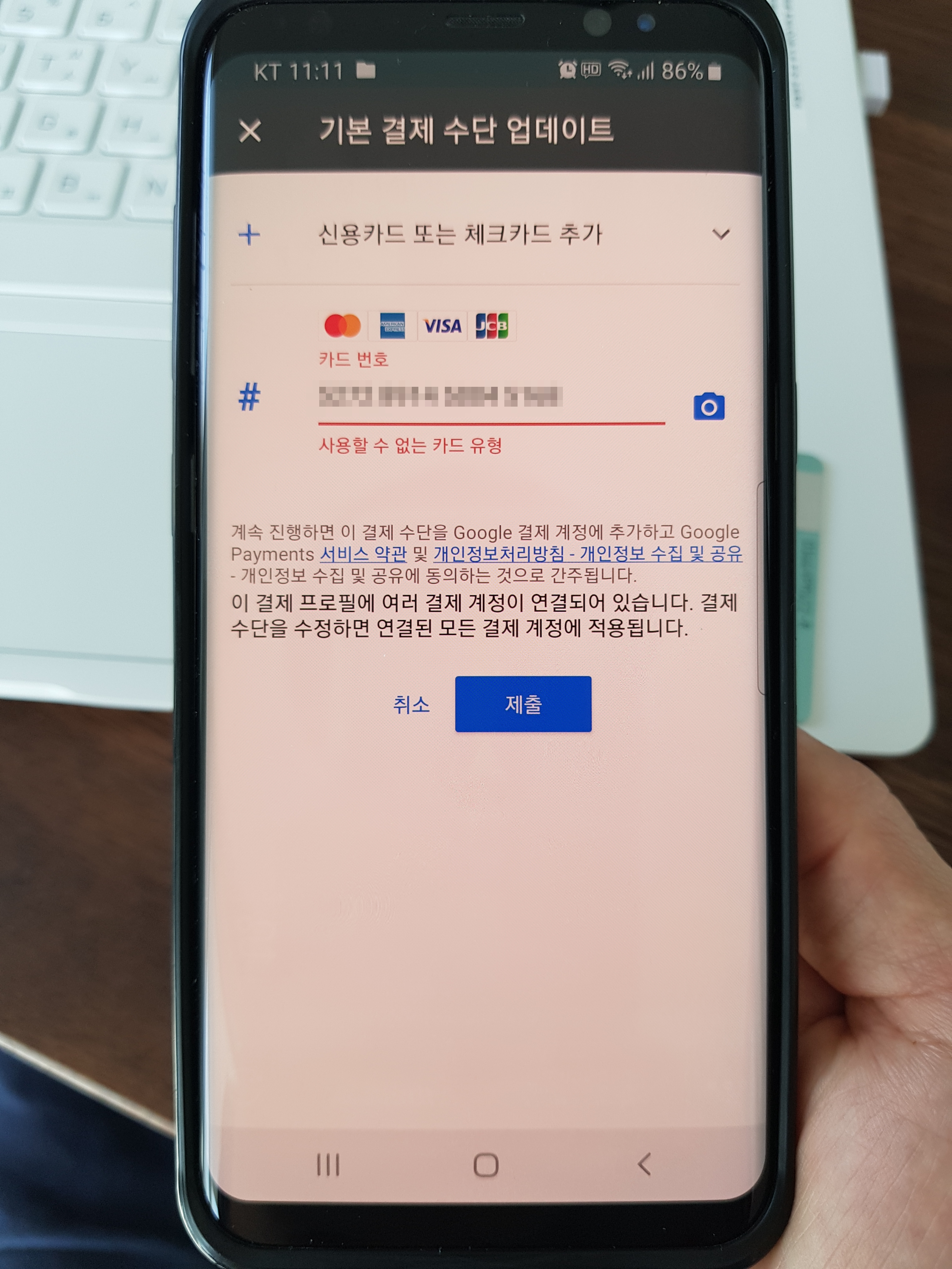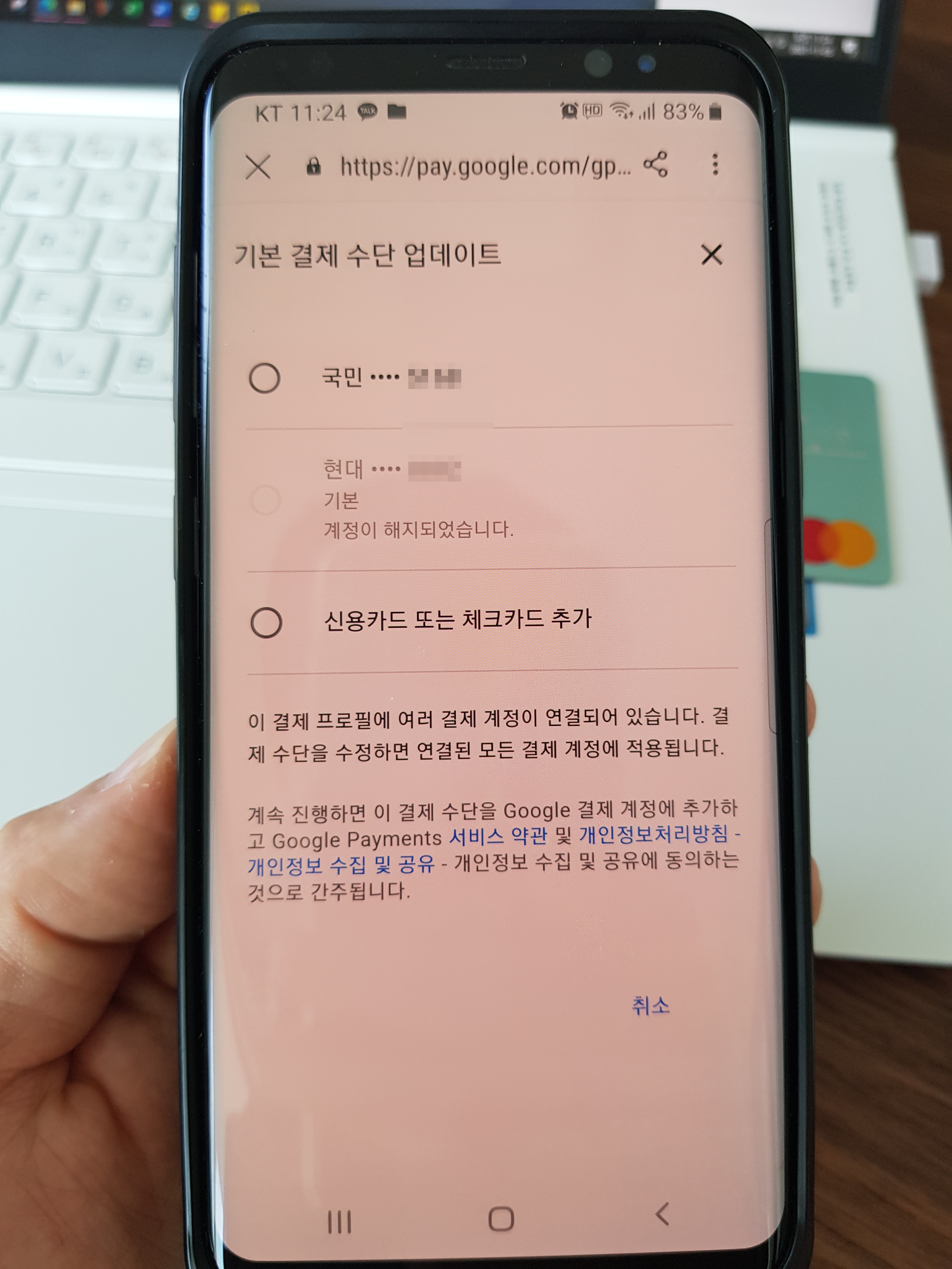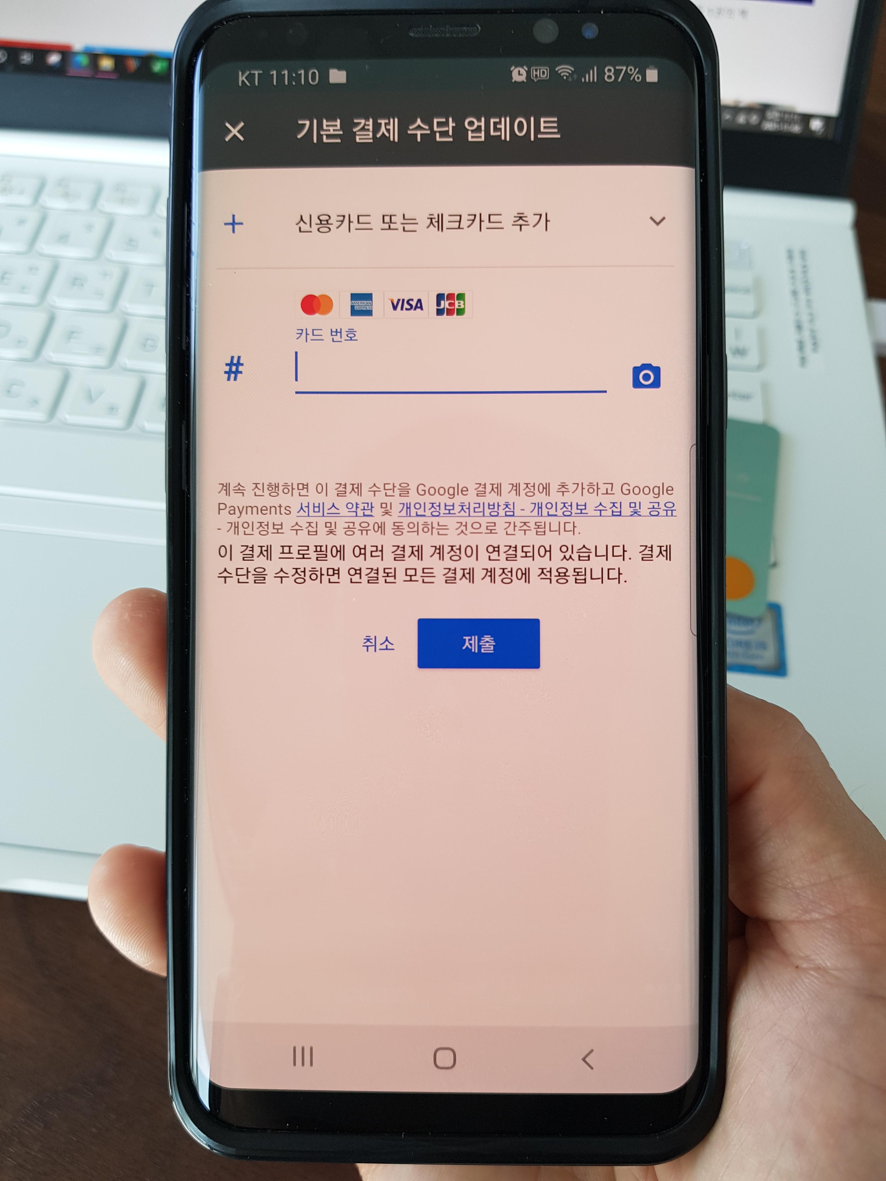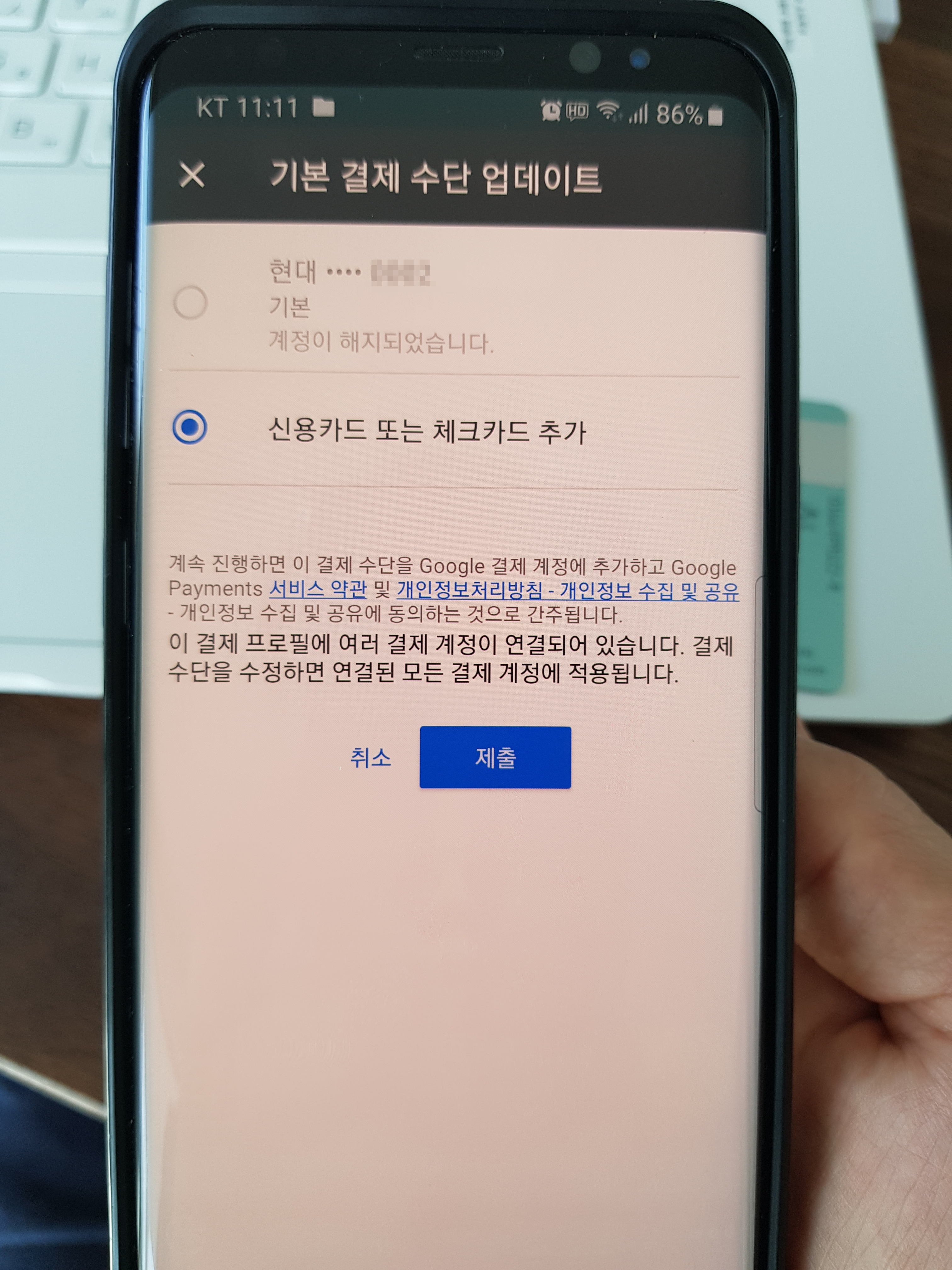 업데이트에 들어가니 이전에 결재등록이 되어있던 현대카드가 계정이 해지되었다고 되어있다. 아래에 있는 '신용카드 또는 체크카드 추가'를 선택하고 '제출'로 들어가 본다.