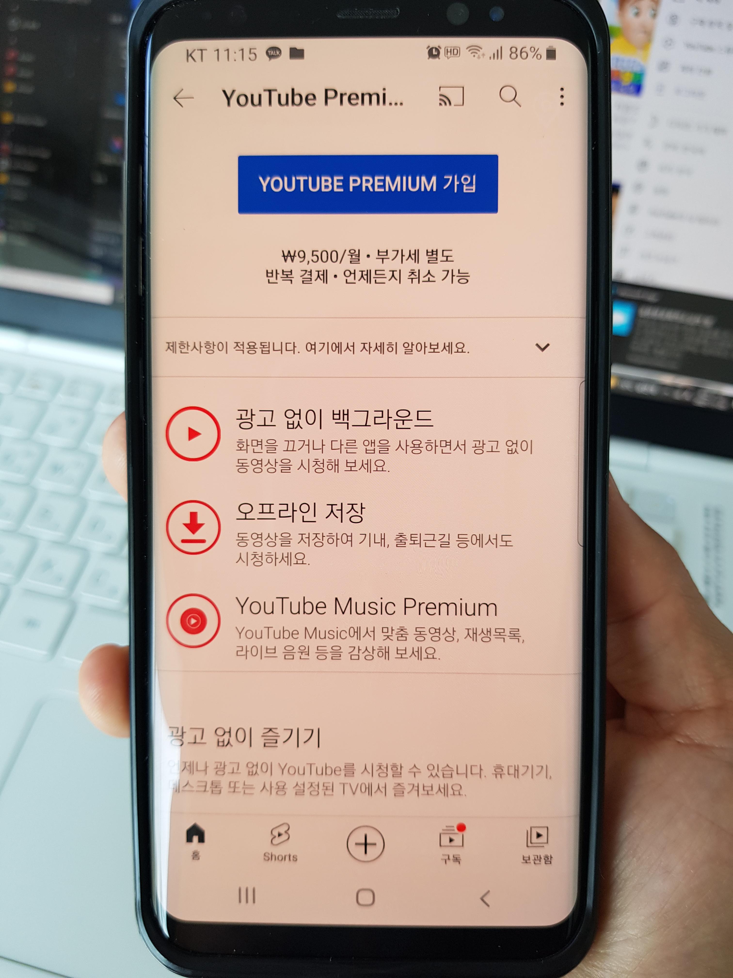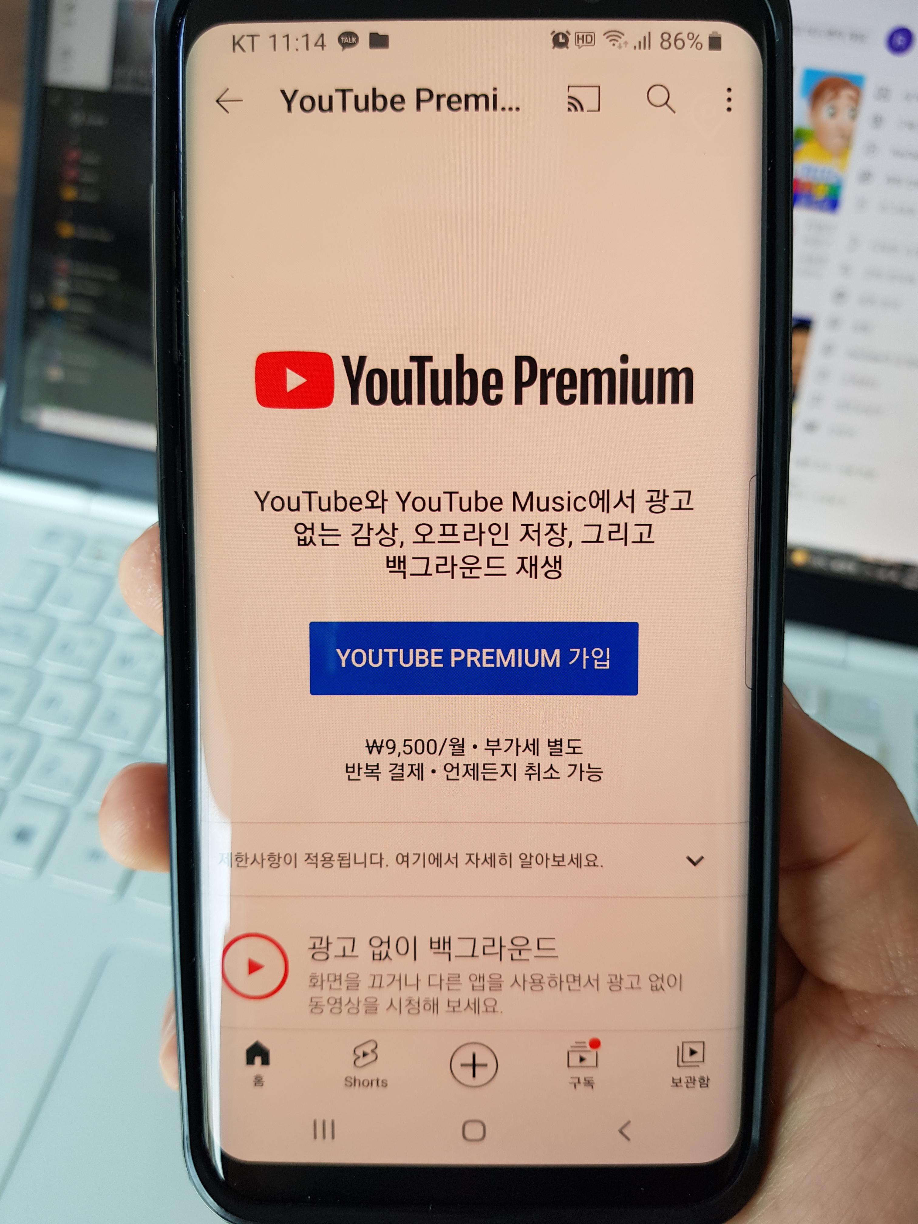 유튜브 프리미엄 한달 이용료: 9,500 원 (VAT 불포함) / VAT 10% 포함시 10,450 원