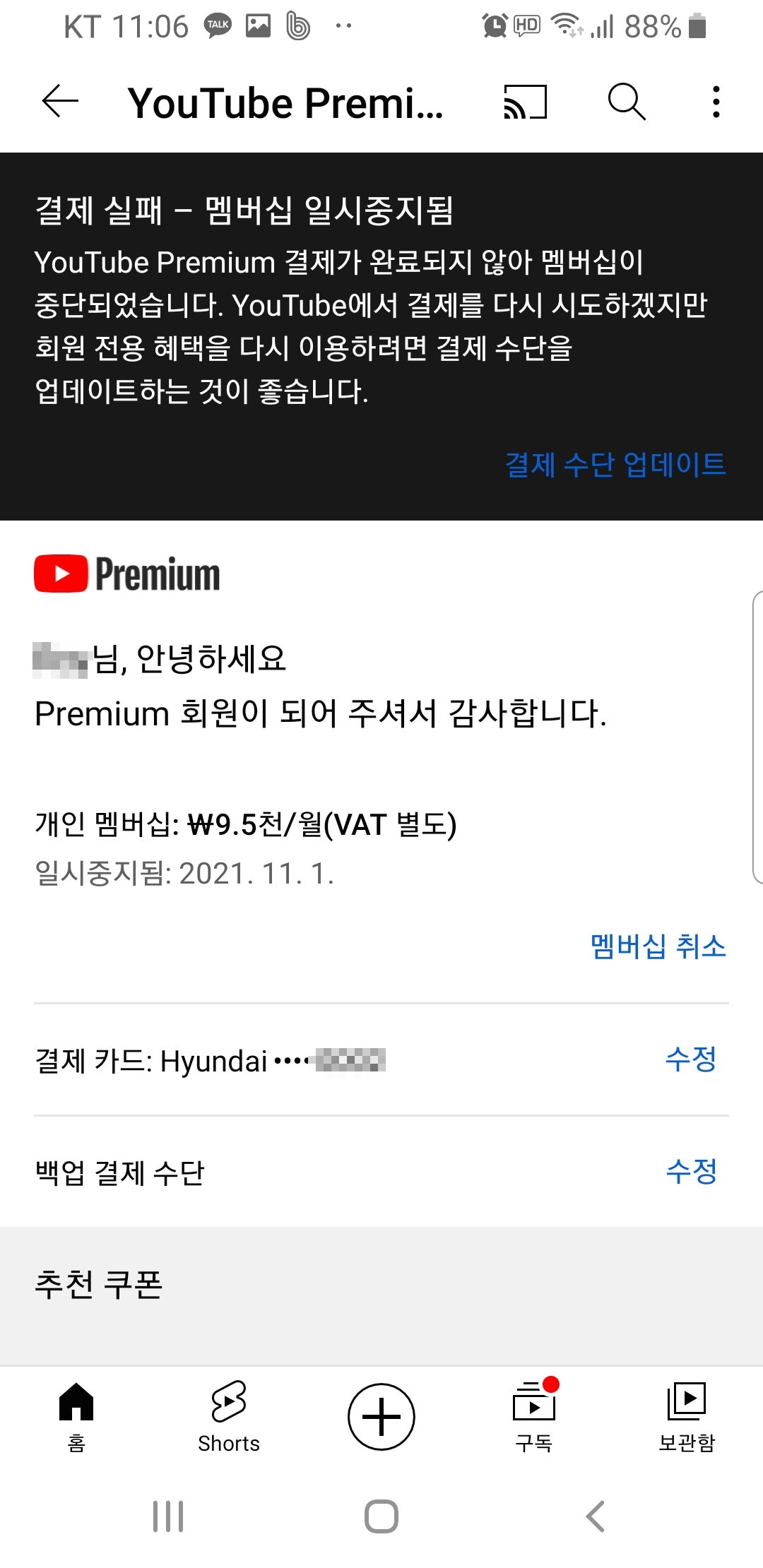 ㅣ유튜브 '사용할 수 없는 카드 유형' 결제 오류