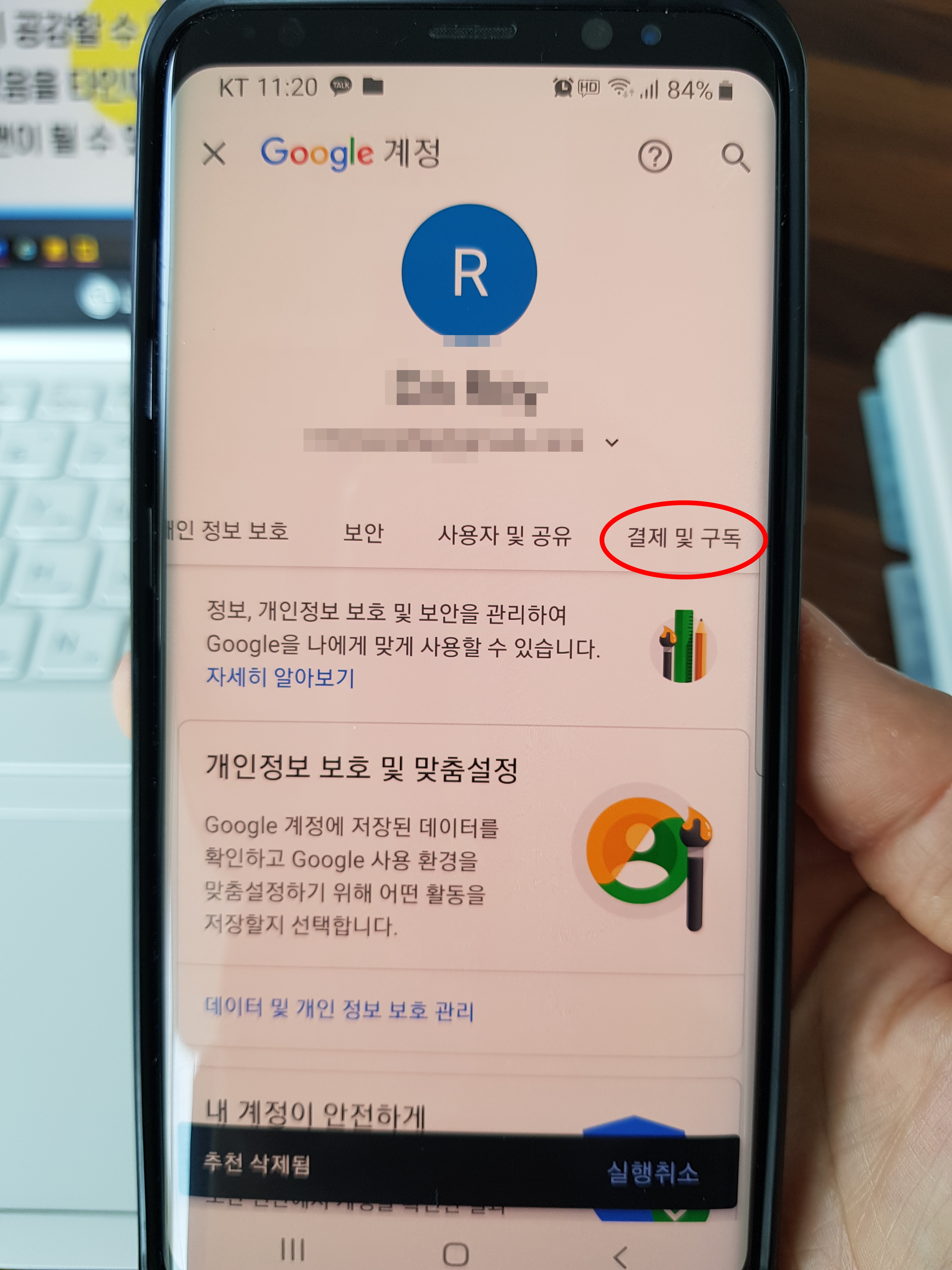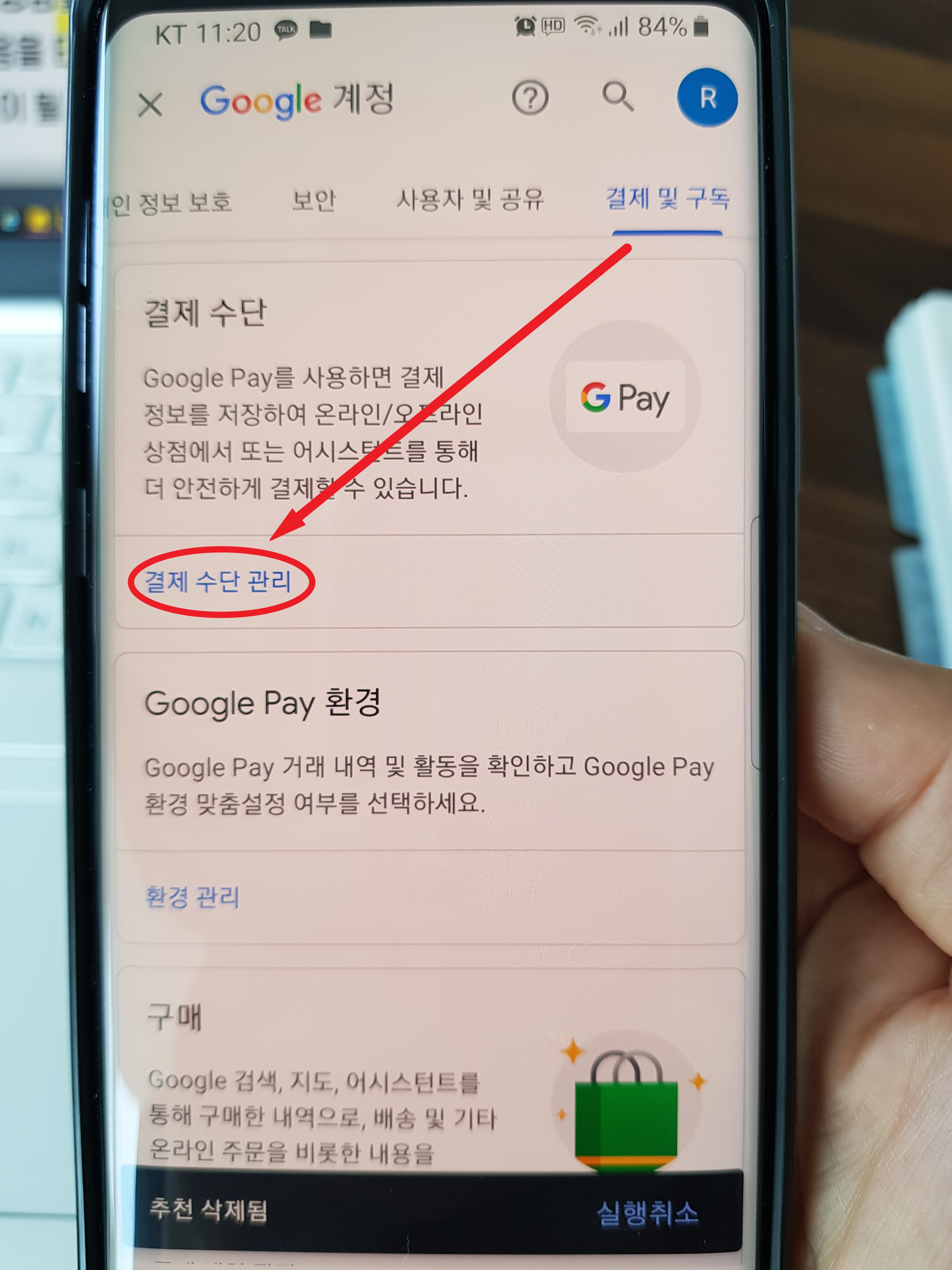 계정관리에서 보이는 화면에서 좌우로 넘기면 보이는 곳에 "결제 및 구독"을 찾아서 들어가보자. 그러면 "결제 수단 관리"가 보일 것이다.