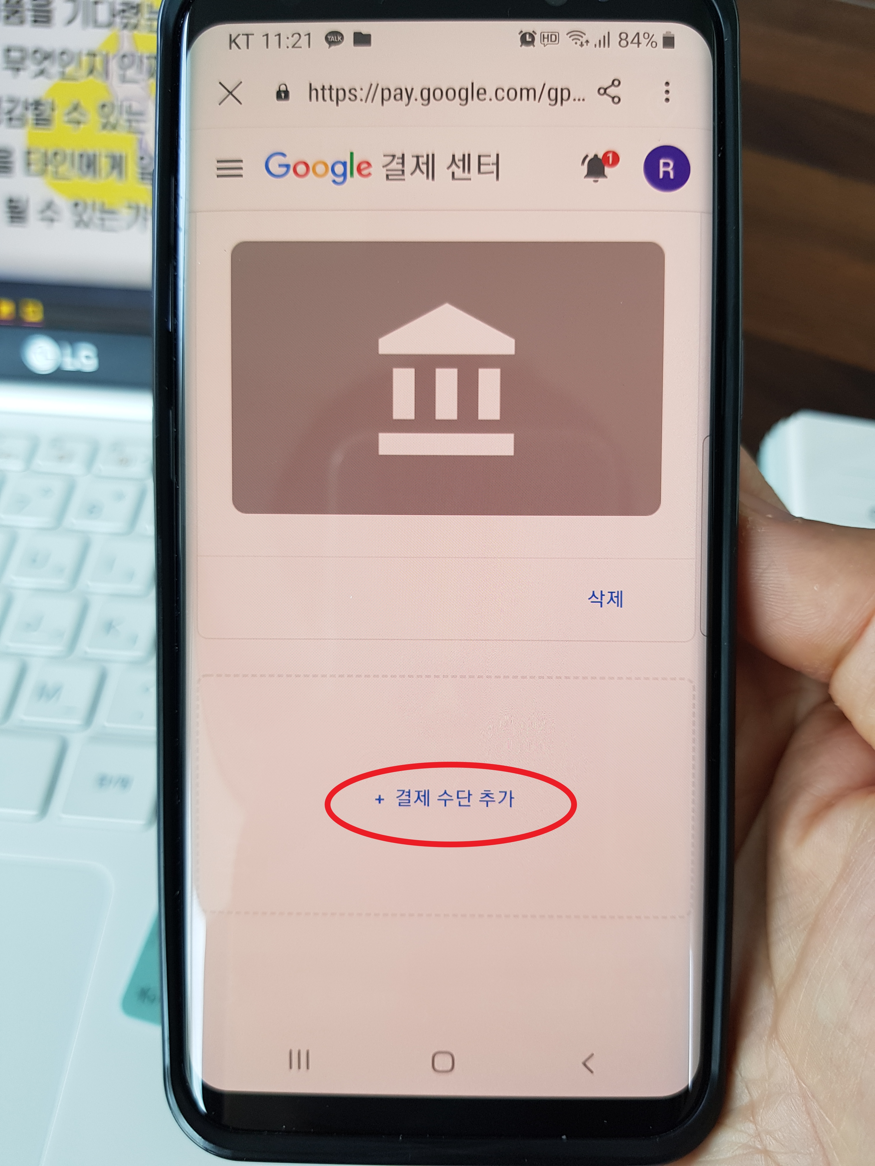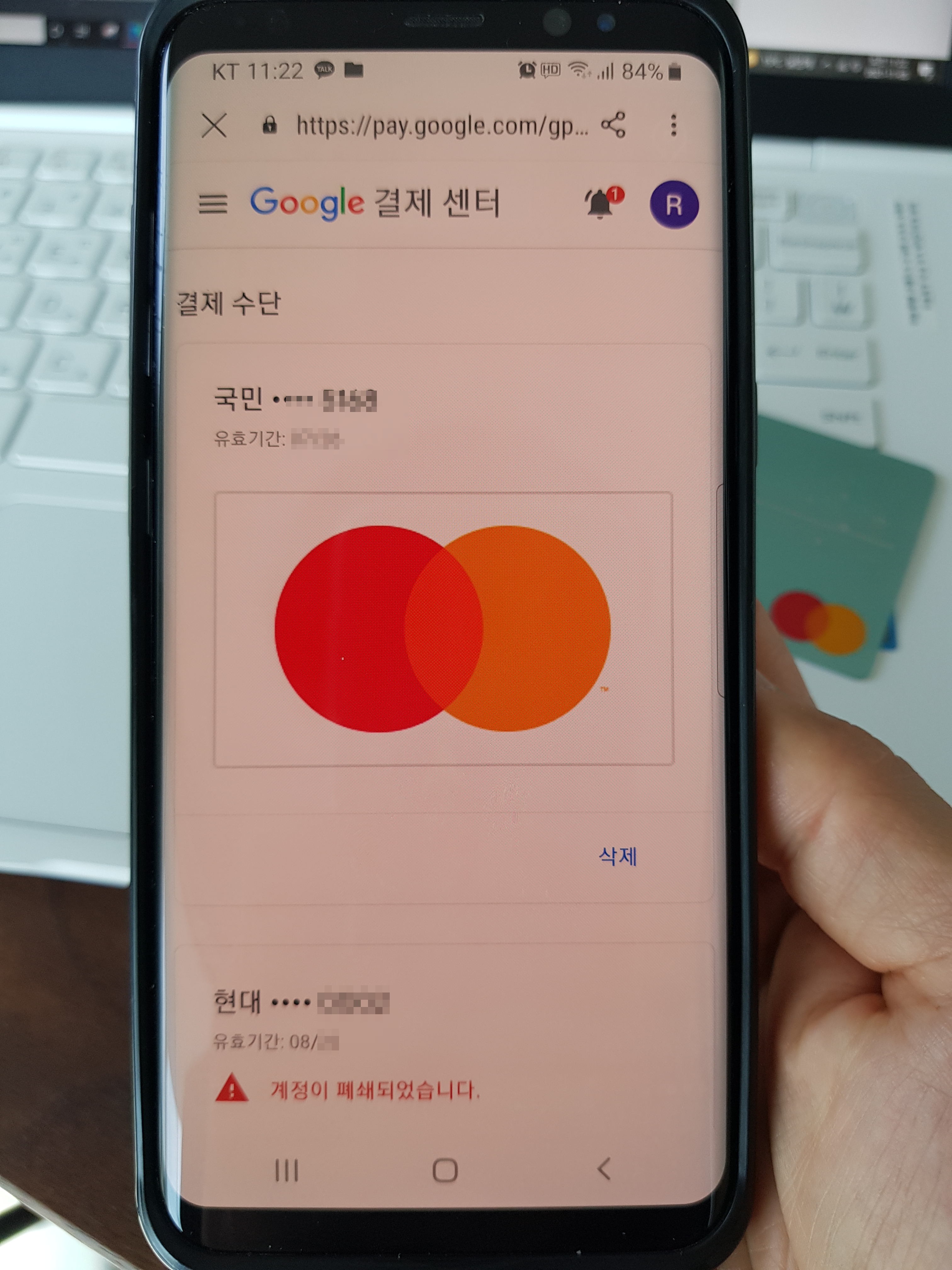 기존에 결제수단으로 걸어놓은 현대카드는 계정이 폐쇄되었다고 보여진다. 안되는건 삭제해버리고 되는 걸 등록해보자. 조금 아래로 내려가면 "+ 결제 수단 추가" 가 보인다.