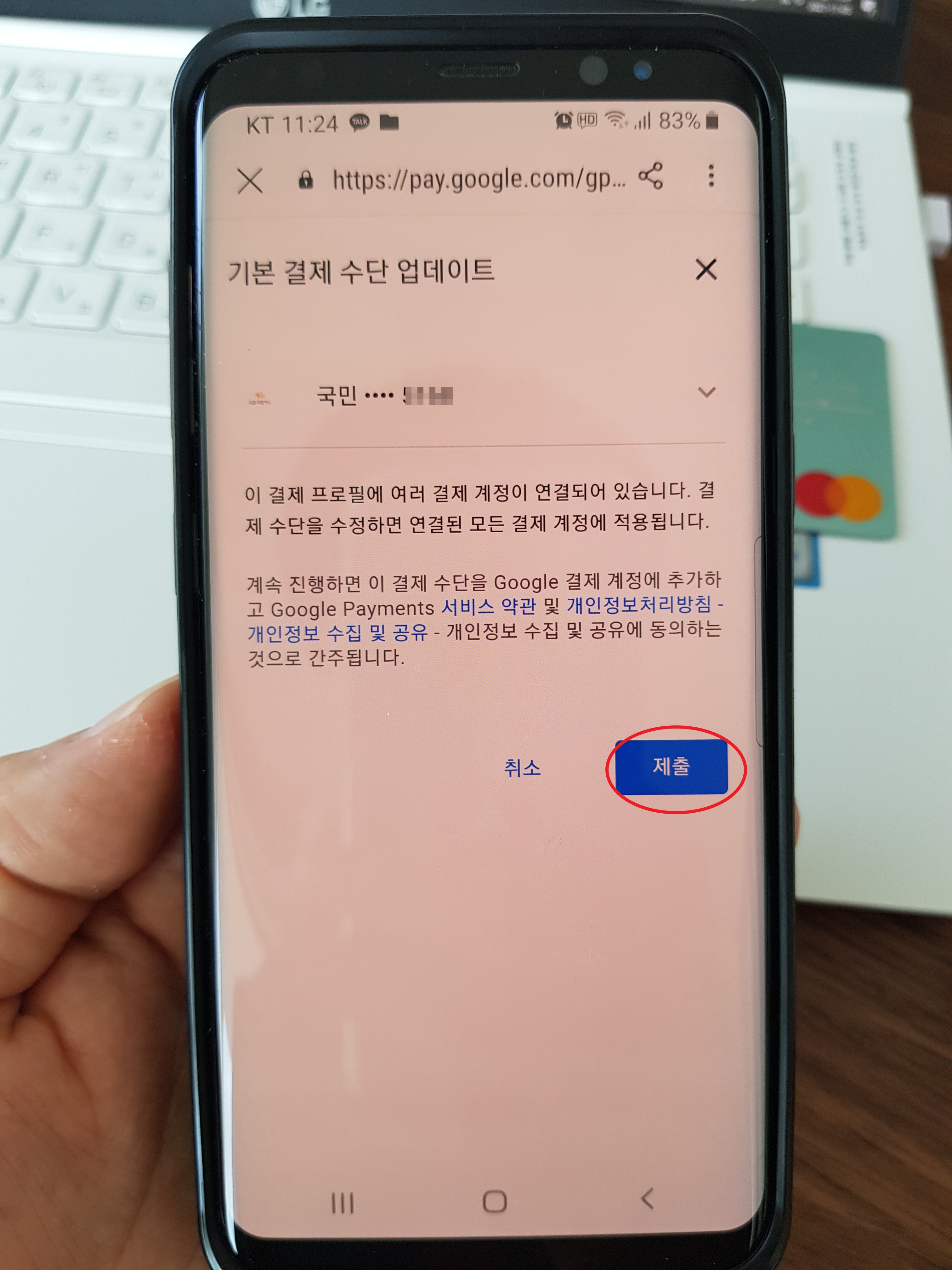 이제 다시 유투브로 돌아가 결제 수단 업데이트로 들어가면 새로 등록한 카드가 보이고 선택한 후 제출하면 된다.