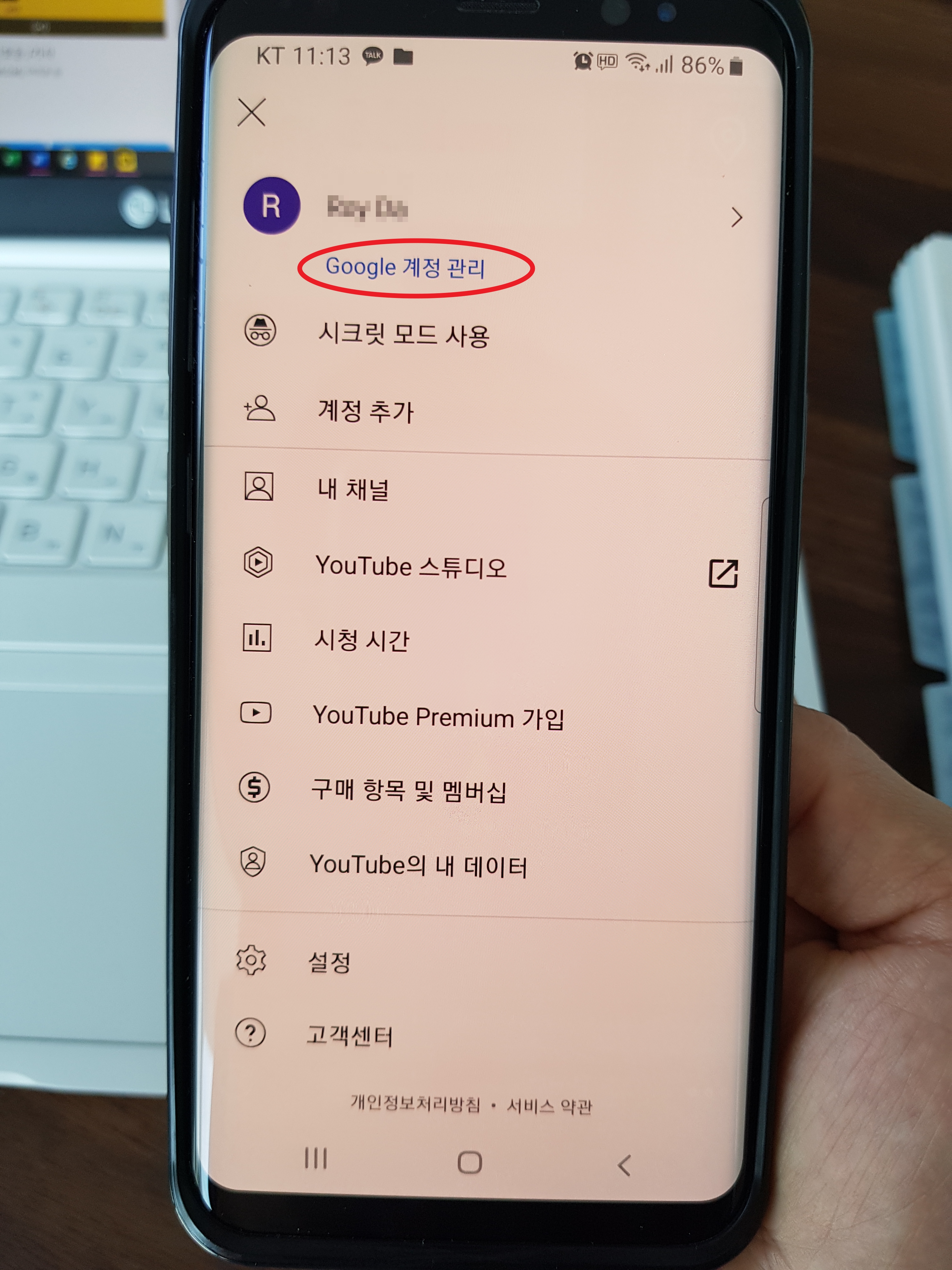 유튜브의 오른쪽 상단에 있는 개인정보로 들어가면 'Google 계정 관리'가 보이는데 클릭해서 들어간다.