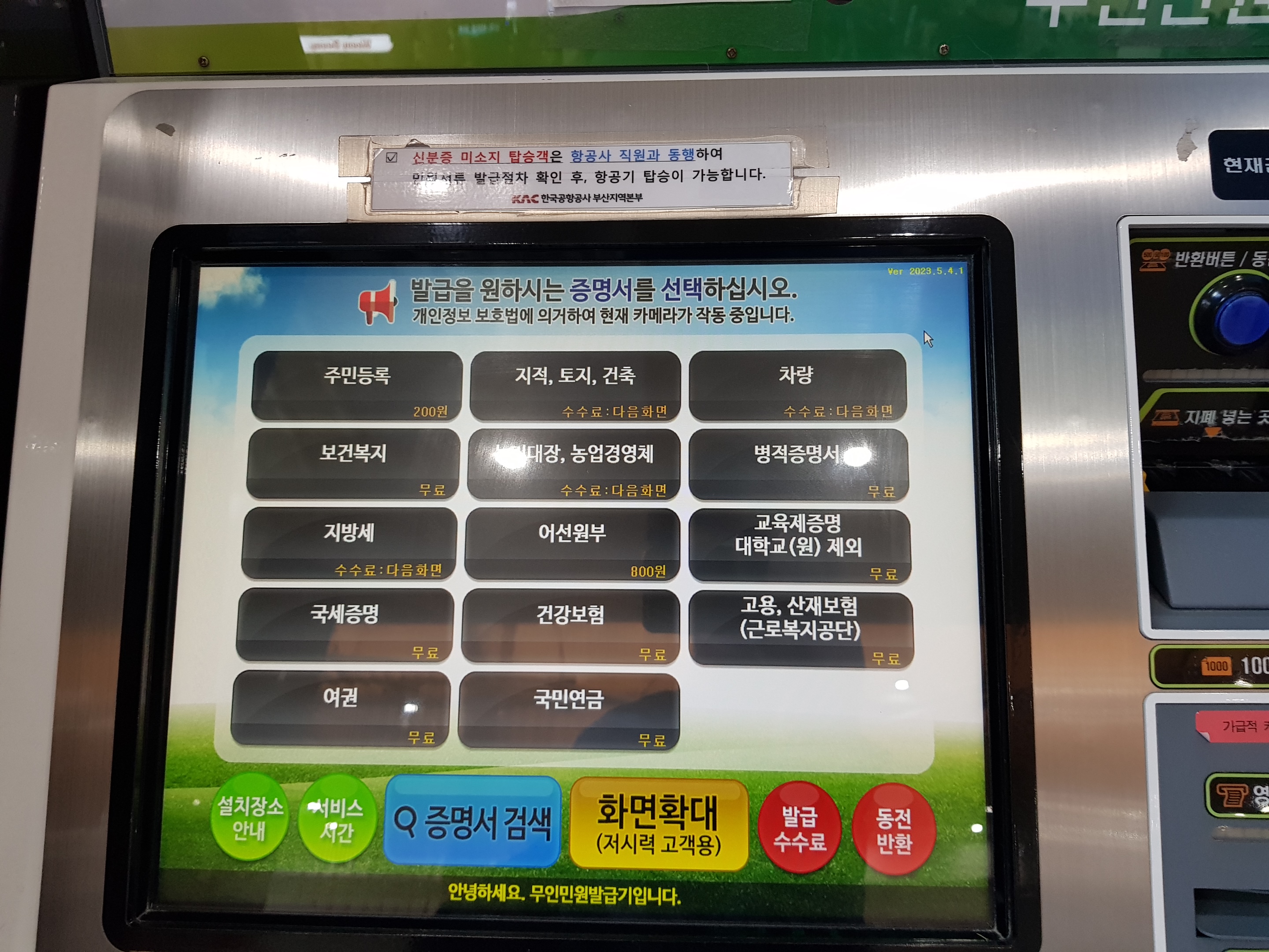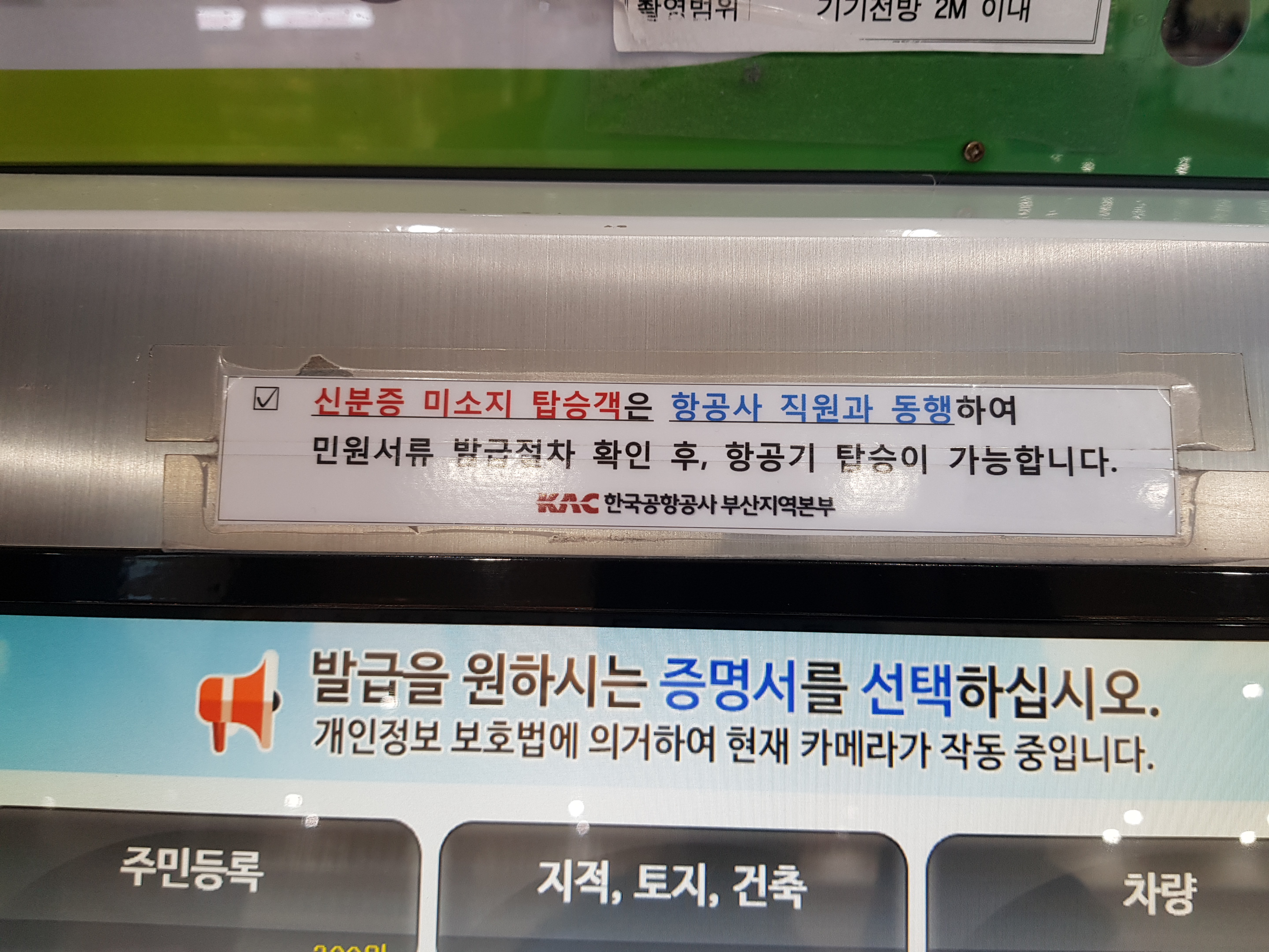 공항의 무인민원 발급기 상단에 '신분증 미소지 탑승객은 항공사 직원과 동행하여 민원서류 발급절치 확인 후, 항공기 탑승이 가능합니다' 라는 안내 문구가 쓰여 있다.
