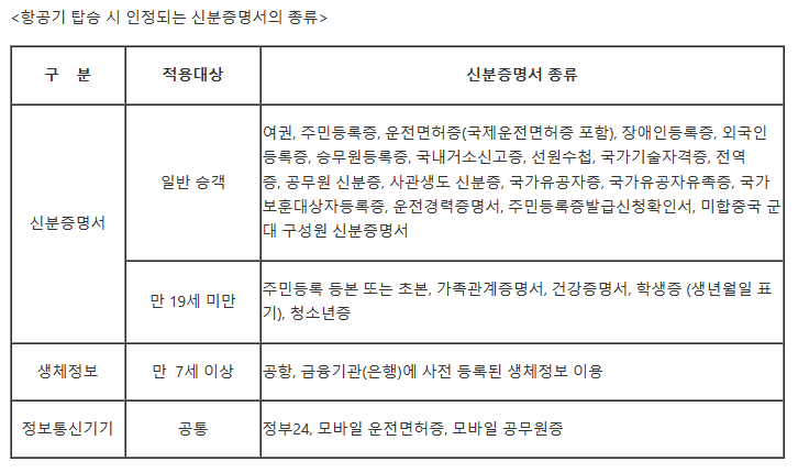 국내에서 항공기 및 선박 이용시에는 위와 같은 서류가 필요하며 신분증이 없을 때는 항공기 탑승이 불가하다. 이에 대한 내용은 이전 포스팅에서 자세히 다루어 보았다.