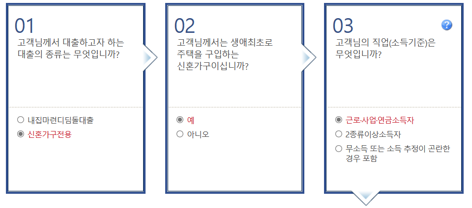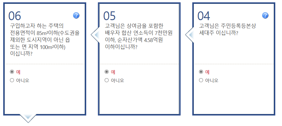* 7가지 항목에서 빨간색으로 표기를 해둔 항목은 전부 '예' 라는 조건이 되어야 주택도시기금 신혼부부 전용 상품 대상이 되고 대출신청이 가능하다.