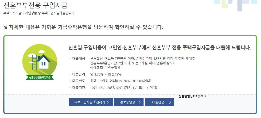 주택도시기금 신혼부부전용 구입자금 바로가기 -> 일반대출 안내 < 신혼부부전용 구입자금 < 주택구입자금대출 < 개인상품 | 주택도시기금 (molit.go.kr)