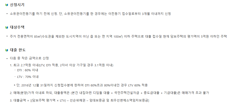 - 최고 2.7억원 이내 (LTV 70이내 / DTI 60% 이내 / 2자녀 이상 가구일 경우 3.1억원 이내)