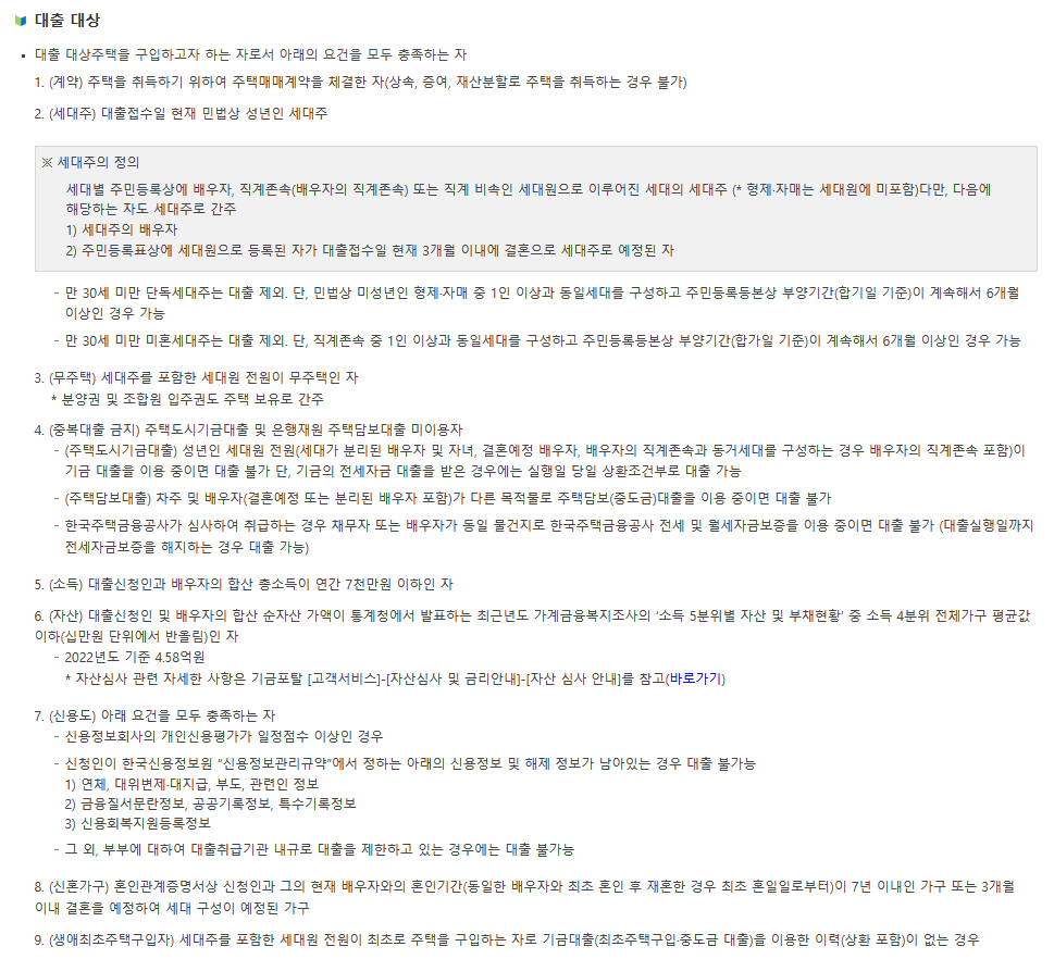 - 부부합산 연소득 7천만원 이하, 순자가액 4.58억원 이하 무주택 세대주