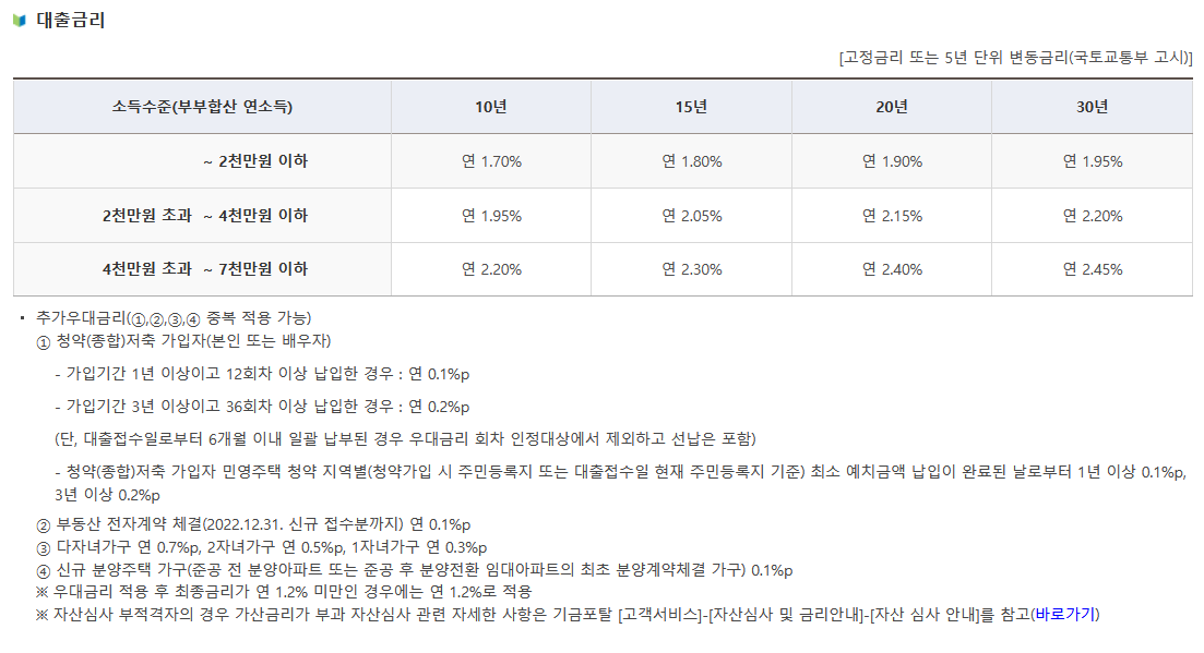 - 연 1.70% ~ 연 2.24% (부부합산 연소득 & 대출기간별로 차등 적용)