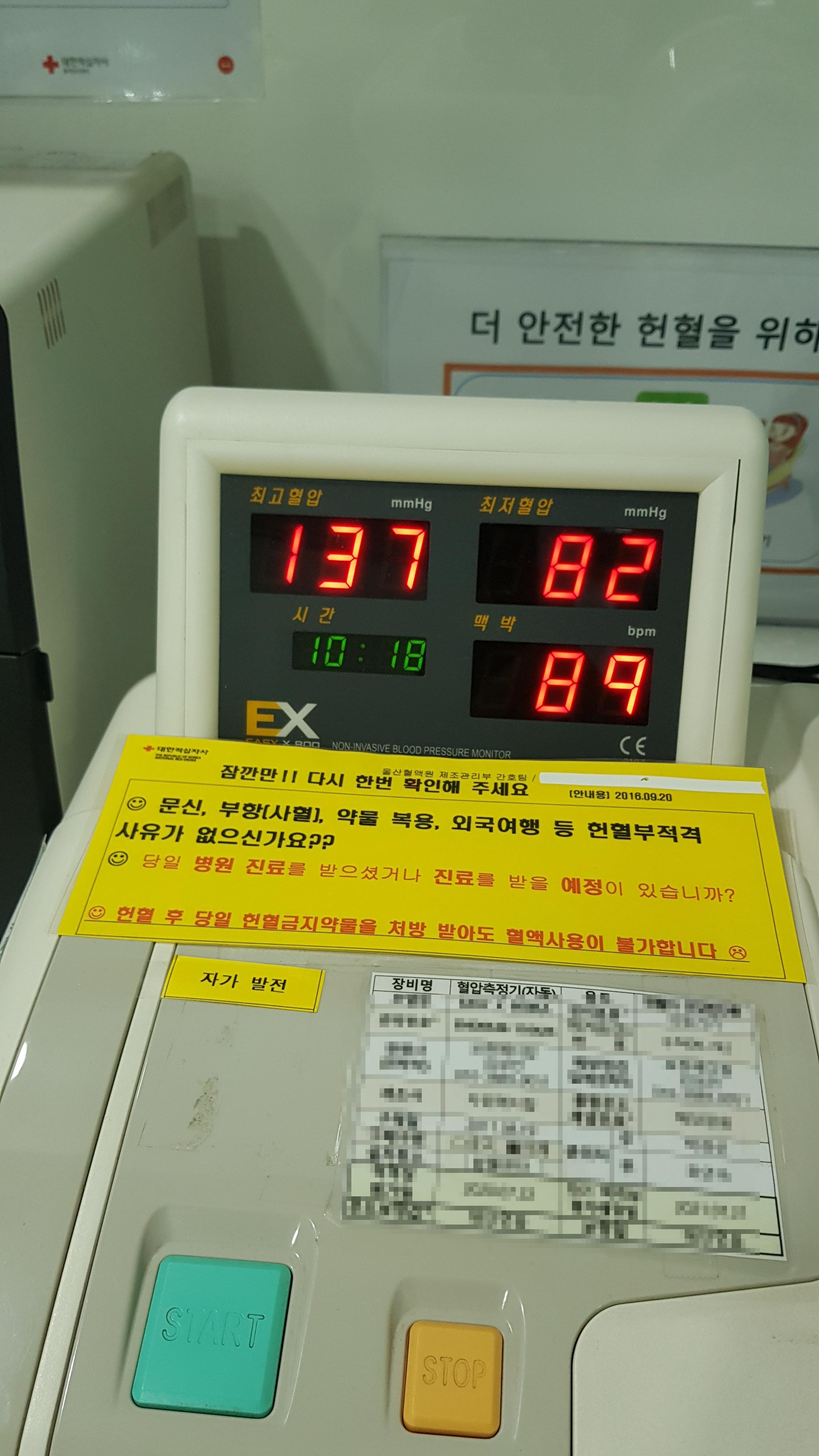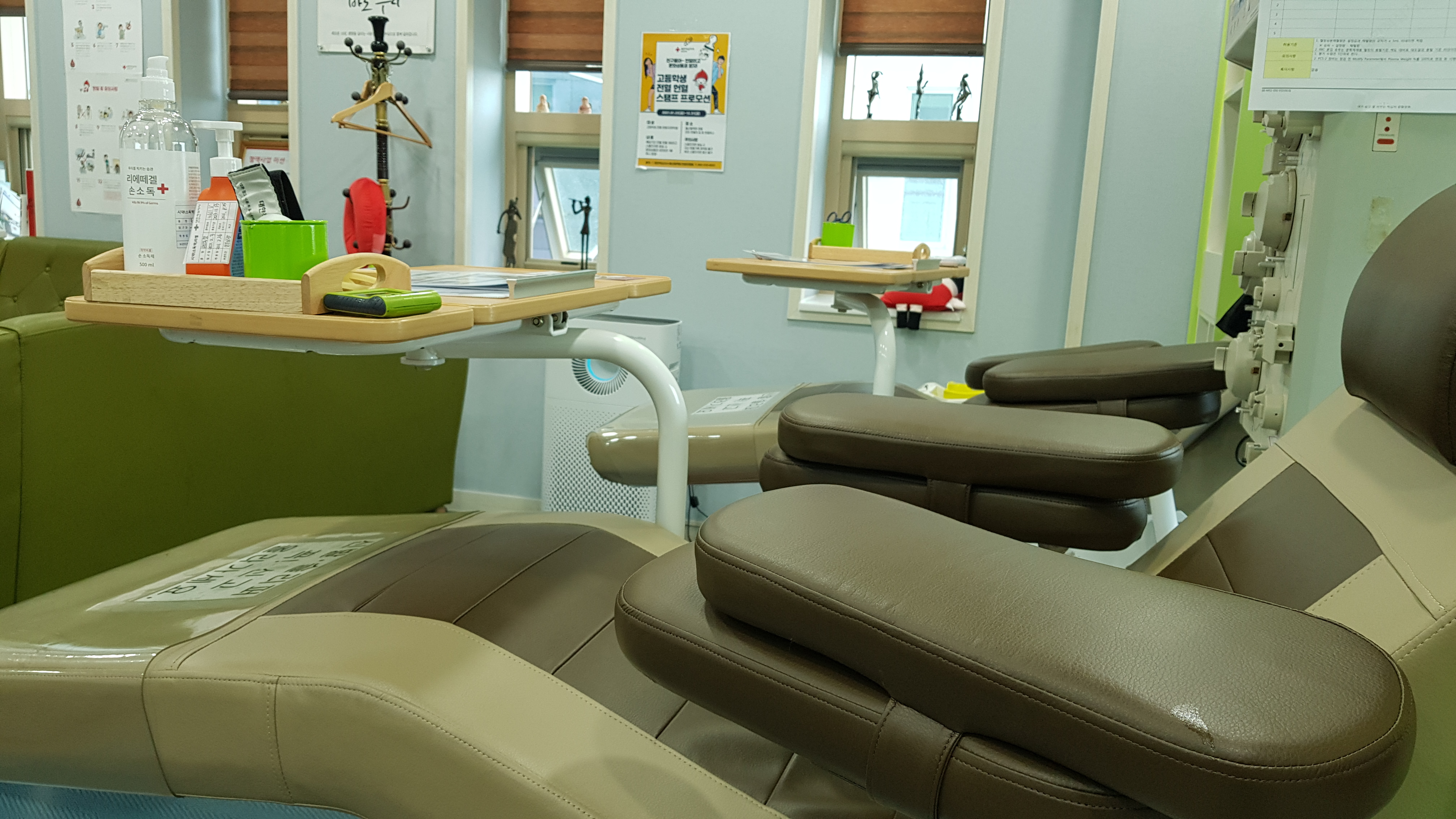 정해진 용량만큼의 헌혈이 되면 헐액기?의 기계음이 들리고 바늘을 뺀다. 바늘을 뺀 곳에 밴드를 붙이고 누워서 휴식을 취하라고 하며 타이머를 놓아 준다. 휴식을 취하며 혈액원 내부를 보니 여전히 필자외 아무도 없다.