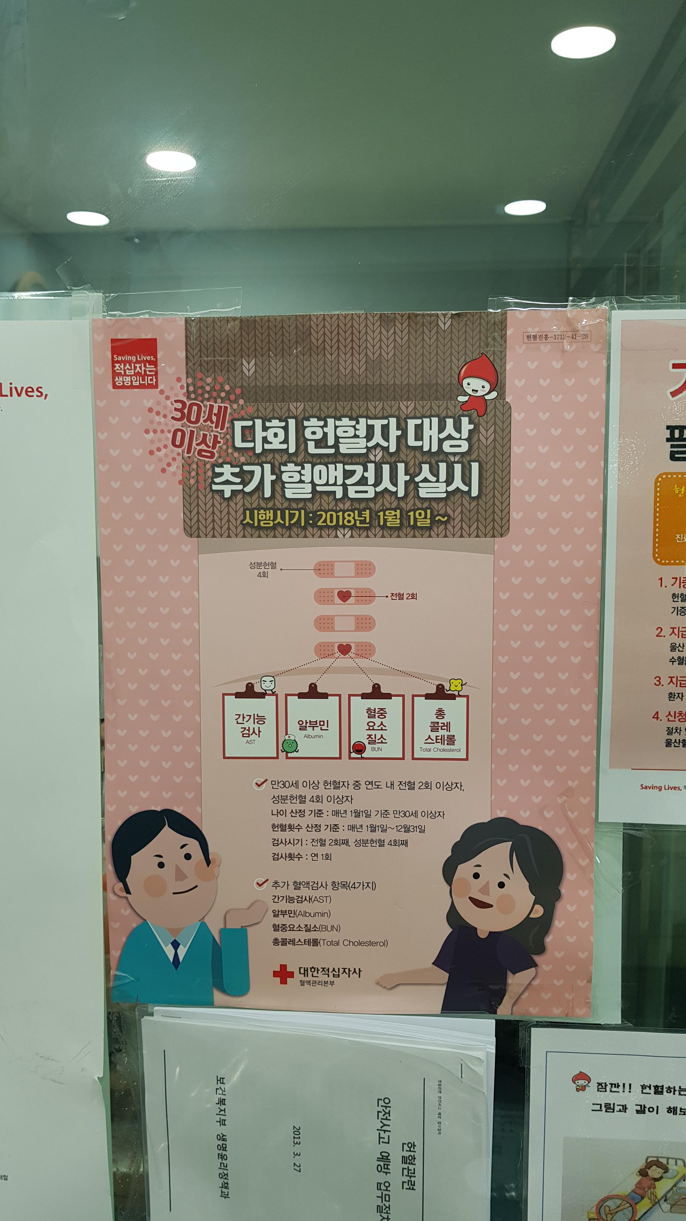 30세 이상 다회헌혈자 대상으로 추가 혈액검사를 실시한다는 포스터를 보았다.