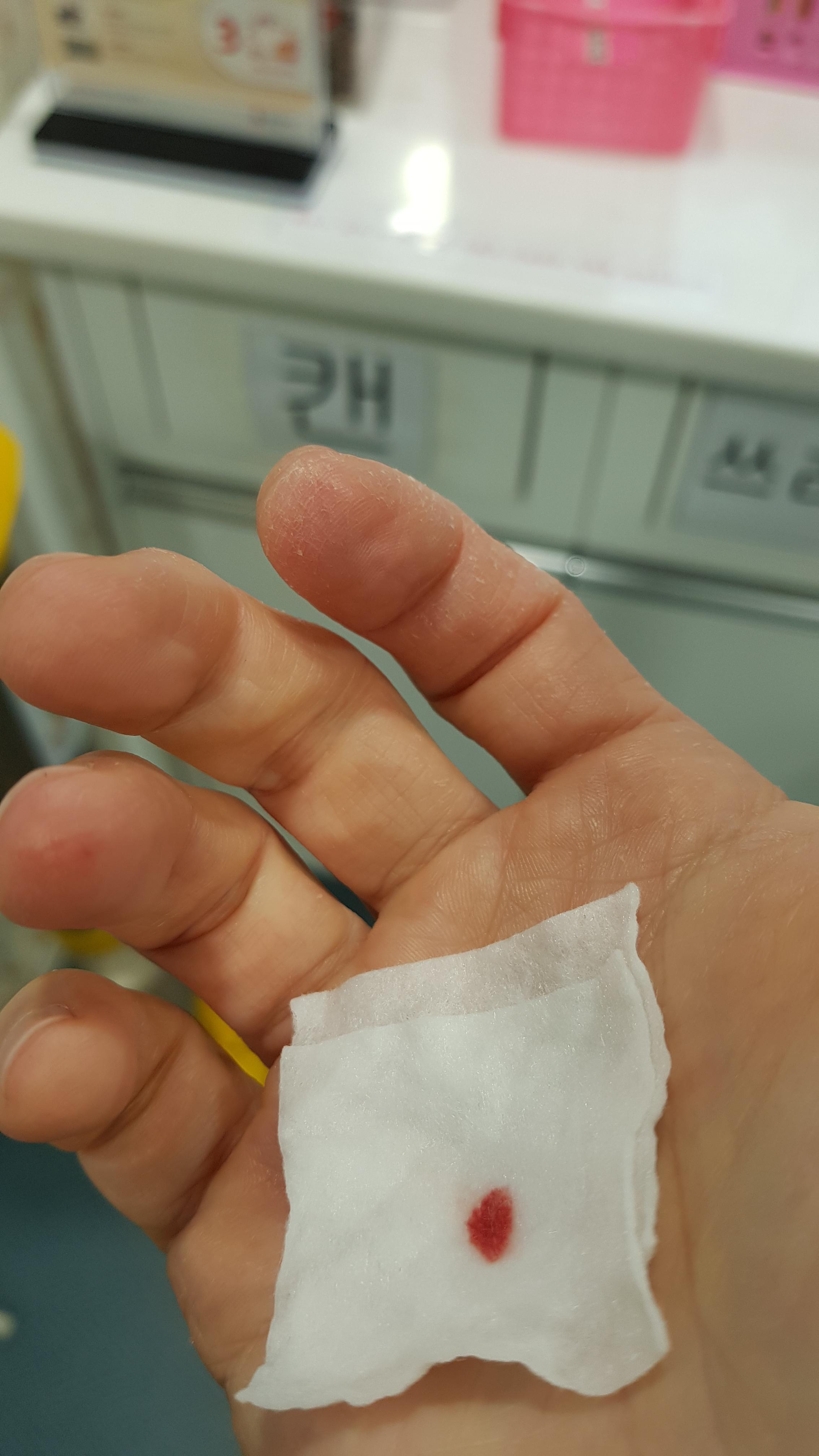 철분성분을 위해 손가락에서 몇방울의 피를 빼 검사를 한다. 신경이 집중된 손가락에 바늘을 찌르는거라 따끔한 통증에 눈을 한번 질끈 감는다.