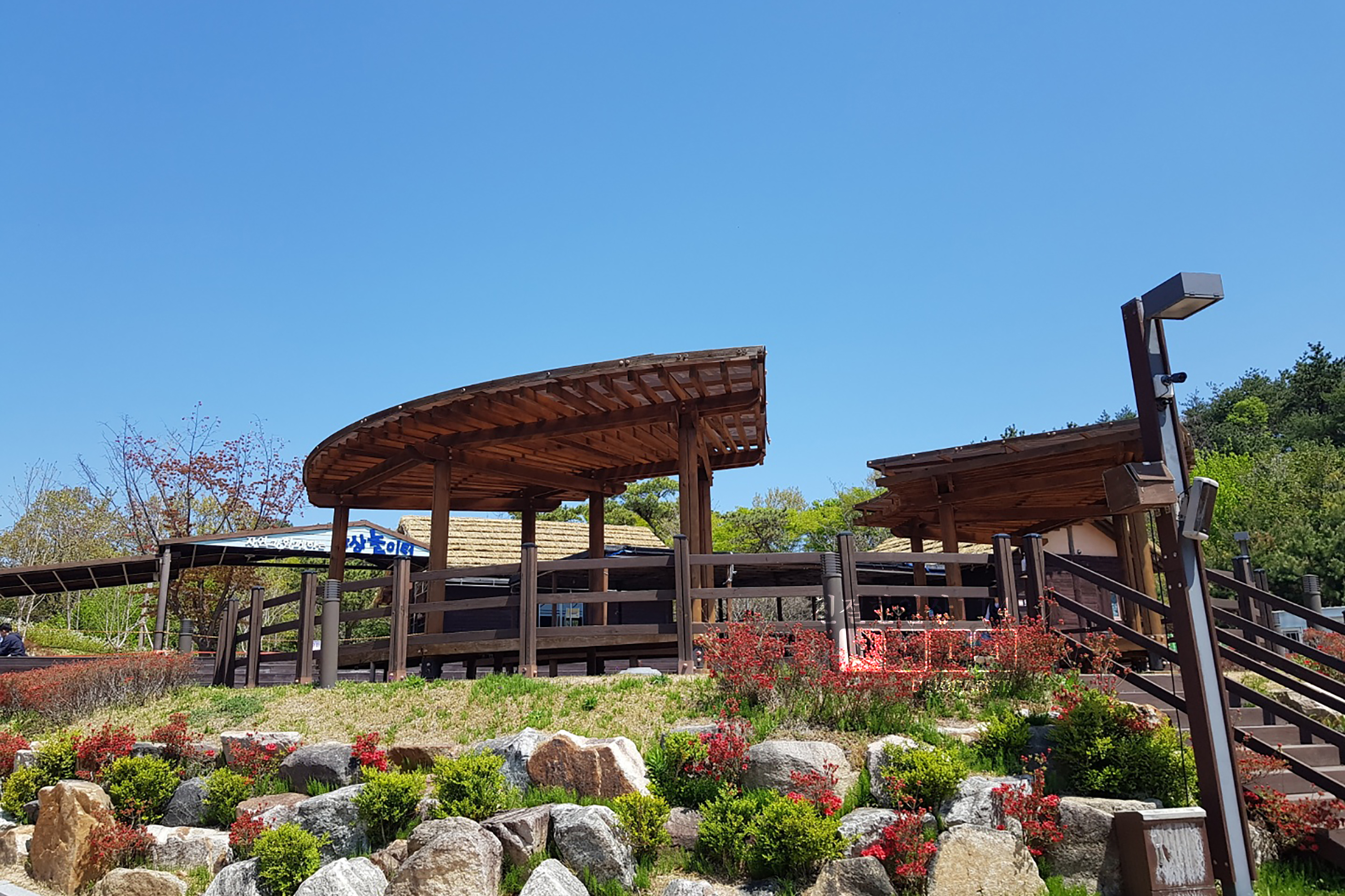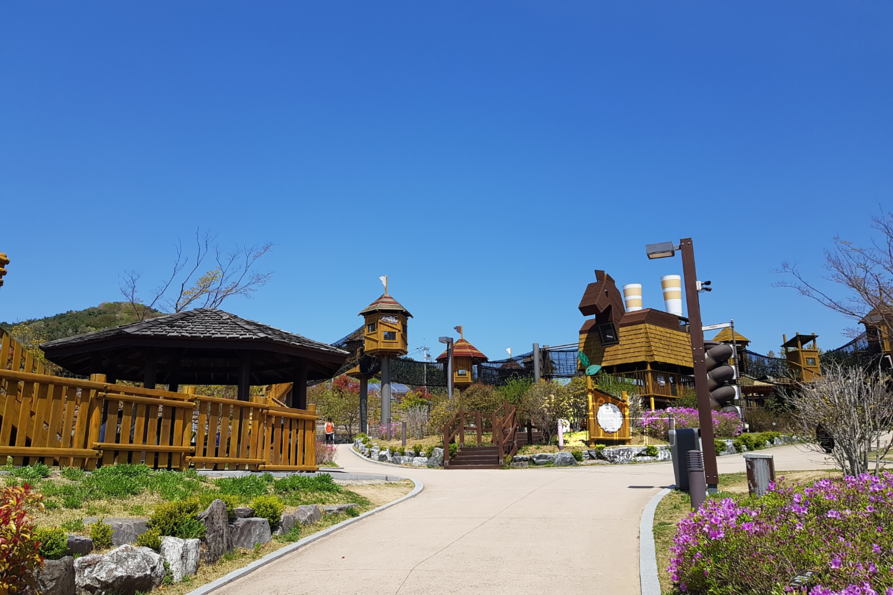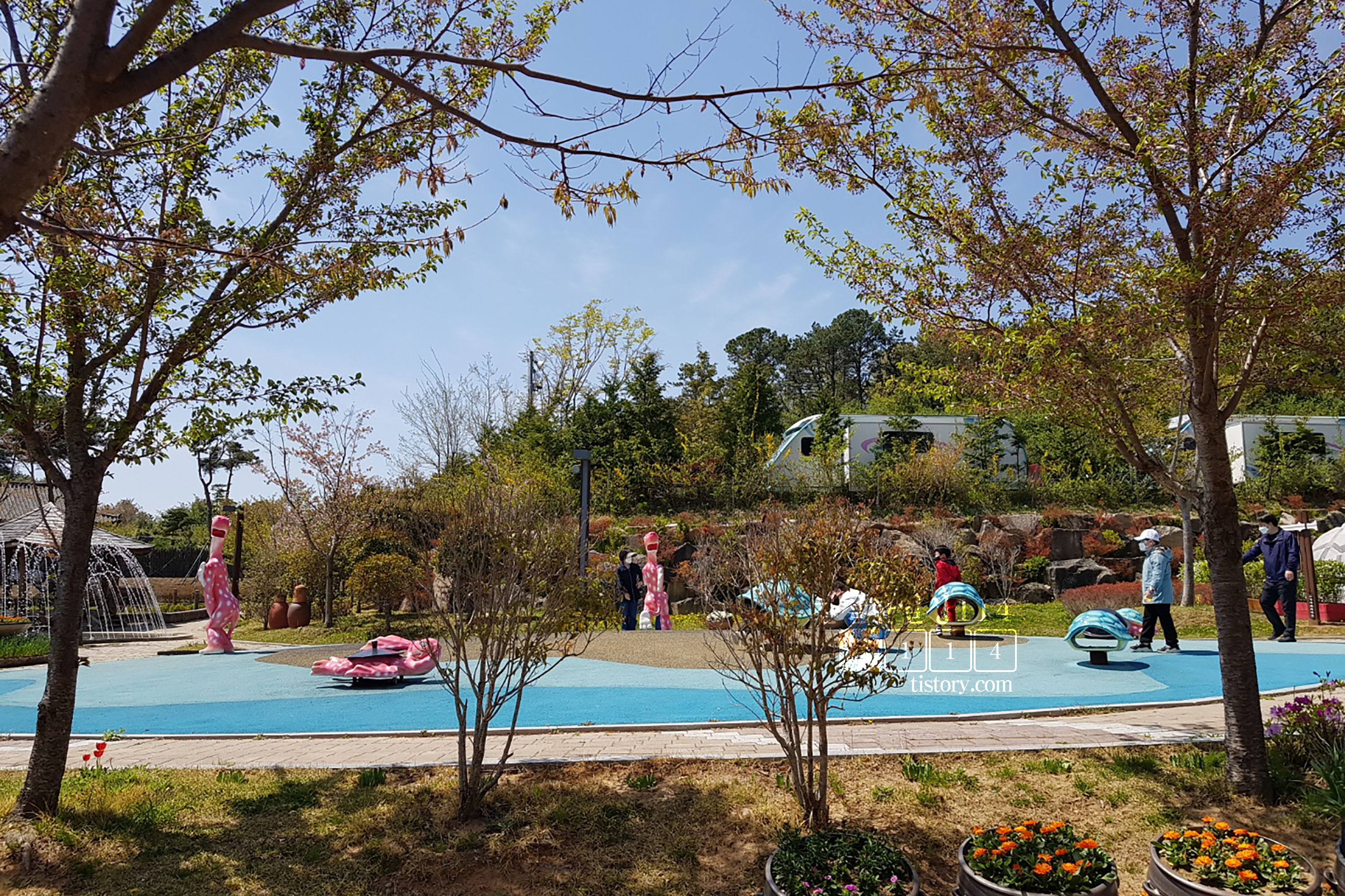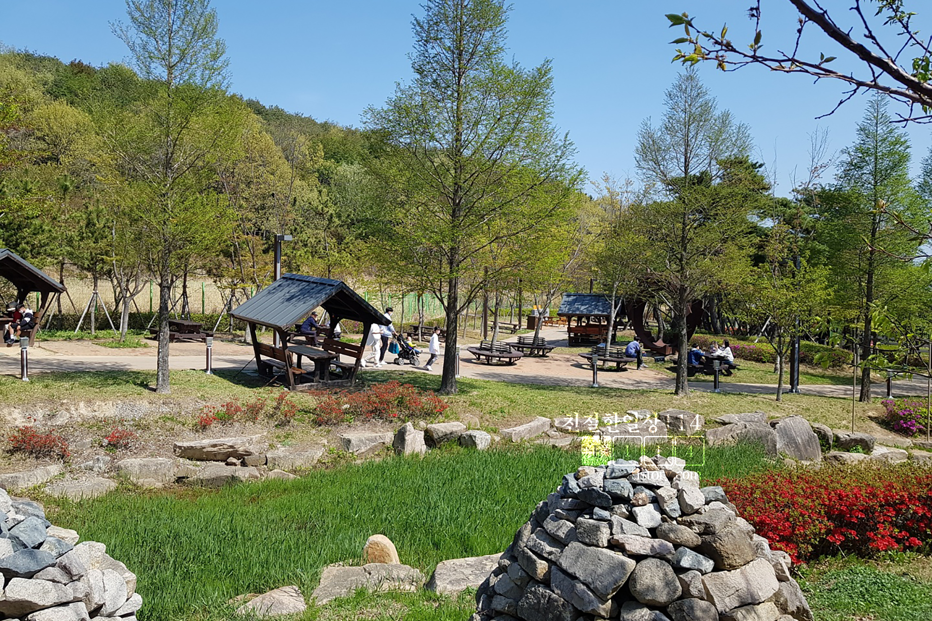 넓은 테마파크 안에는 곳곳에 앉아서 쉴 수 있는 의자, 테이블과 원두막이 있어서 좋았다. 돗자리가 있으면 나무그늘에 앉아도 되고, 돗자리가 없어도 마련된 오두막 같은 곳에 앉아서 쉬며 싸온 도시락을 먹을 수 있다.