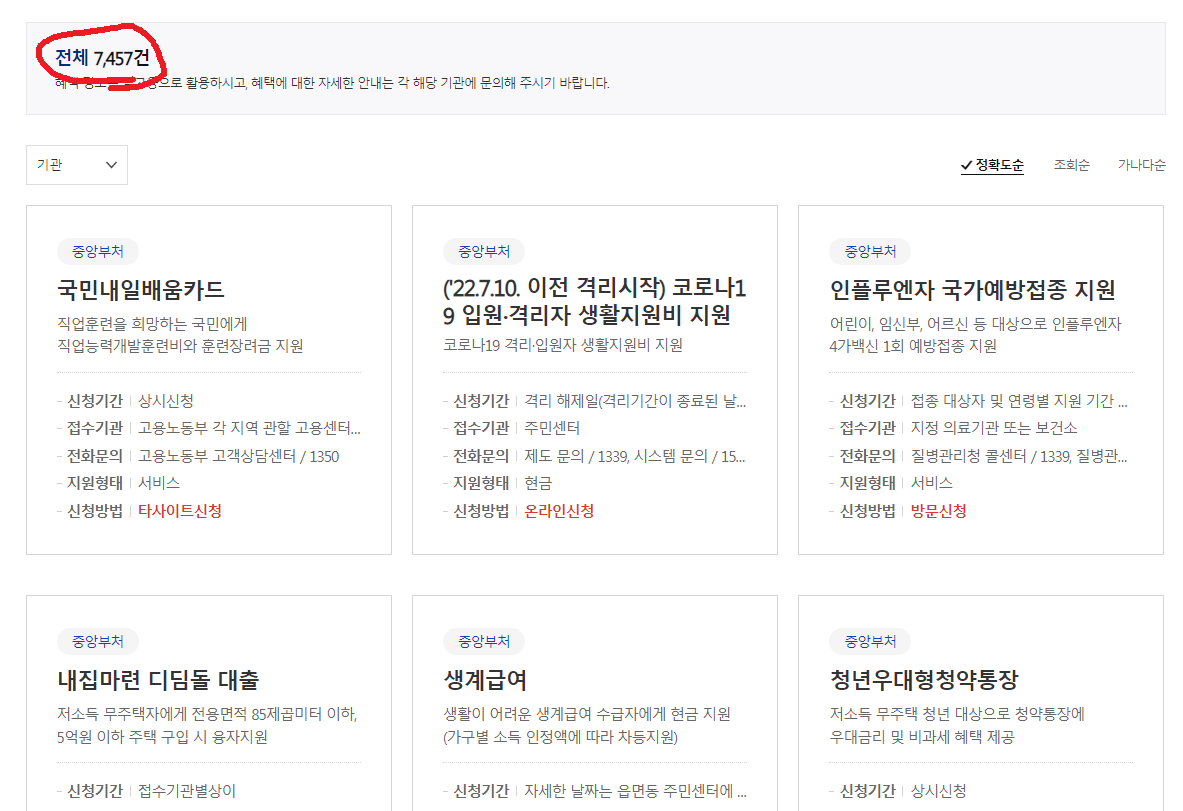 가장 첫번째 페이지에 올라와서 눈에 띄었던 지원으로는 '국민내일배움카드', '디딤돌대출', '코로나 생활비지원' 등이 있다.