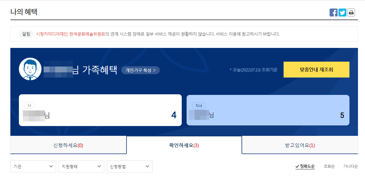 로그인을 하고 들어가면 아래의 화면이 보인다. 화면에는 내가 지금 현재 받고 있는 혜택과 신청가능한 혜택, 확인해볼 혜택이 보여진다. 그리고 등록된 가족이 있다면 가족의 혜택도 함께 조회해 볼 수 있다.