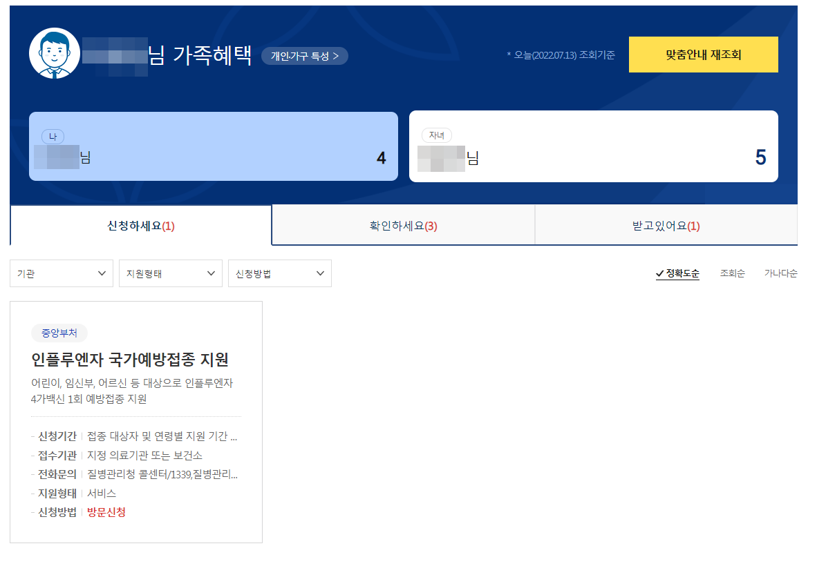 현재 자녀가 받고 있는 혜택으로는 아동수당 1건이 있었고, 받을 수 있는 혜택으로는 인플루엔자 국가예방접종 지원이 있다. 예방접종을 깜빡하고 있었는데 상기하게 되었다.