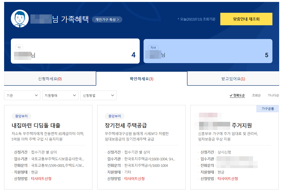 '내집마련 디딤돌 대출' / '장기전세 주택공급' / '신혼부부 주거지원' 3가지 혜택에 대해서 일부 조건이 해당되어 내역에 떠있다.