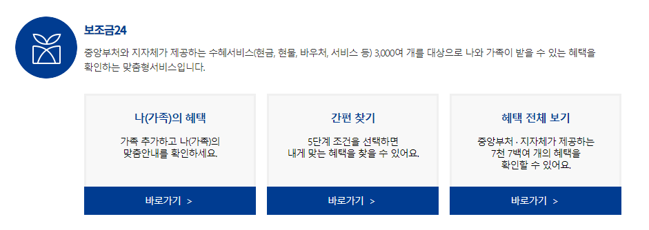 보조금24: 중앙부처와 지자체가 제공하는 현금, 서비스 3,000여 개를 대상으로 나와 가족이 받을 수 있는 혜택을 확인하는 맞춤형서비스입니다.