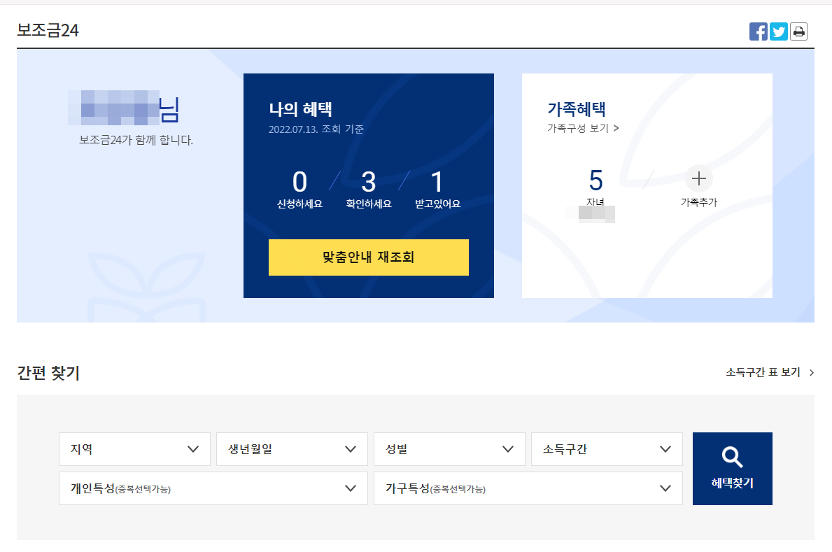 로그인을 하고 들어가면 아래의 화면이 보인다. 화면에는 내가 지금 현재 받고 있는 혜택과 신청가능한 혜택, 확인해볼 혜택이 보여진다. 그리고 등록된 가족이 있다면 가족의 혜택도 함께 조회해 볼 수 있다.