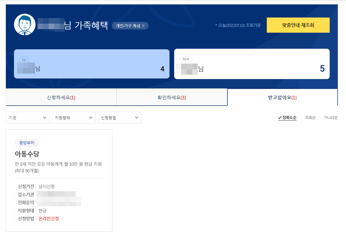 가족으로 등록된 자녀정보를 바탕으로 가족이 받고 있는 혜택과 받을 수 있는 혜택들도 볼 수 있다.