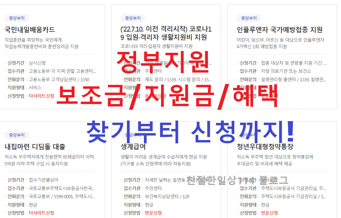 나라에서 국민들에게 여러가지 지원과 혜택을 제공하고 있다. (중앙부터와 지자체가 제공하는 혜택으로는 7천7백여 개에 달한다) 그런데 이 혜택과 지원금을 잘 알고 매년, 매달 받아가는 사람들이 있는 반면 내가 지원금 대상인데도 불구하고 몰라서 받지 못 하는 경우도 많은 것으로 알고 있다.