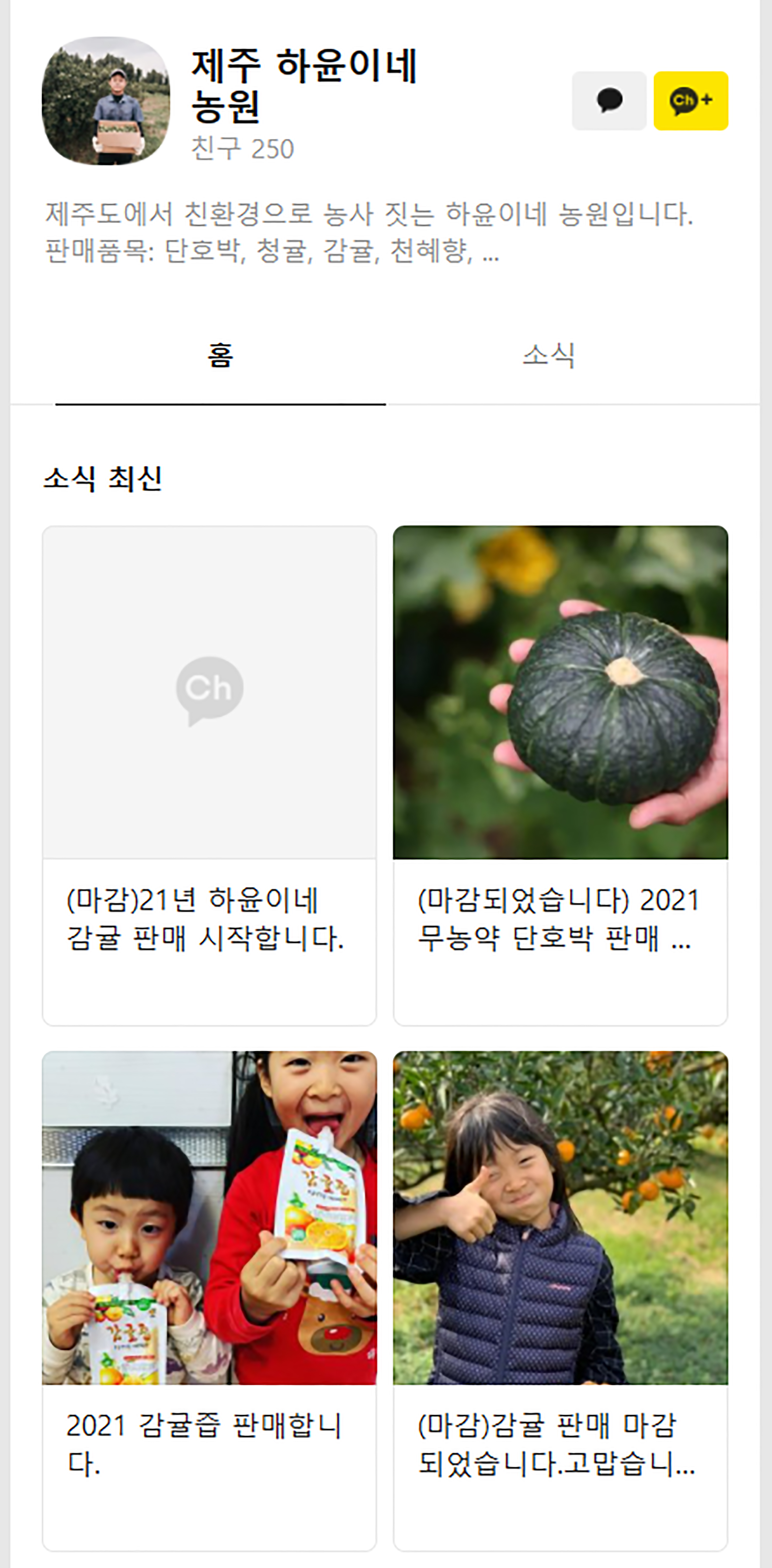 카카오톡 플러스친구 ‘하윤이네농원’ 검색