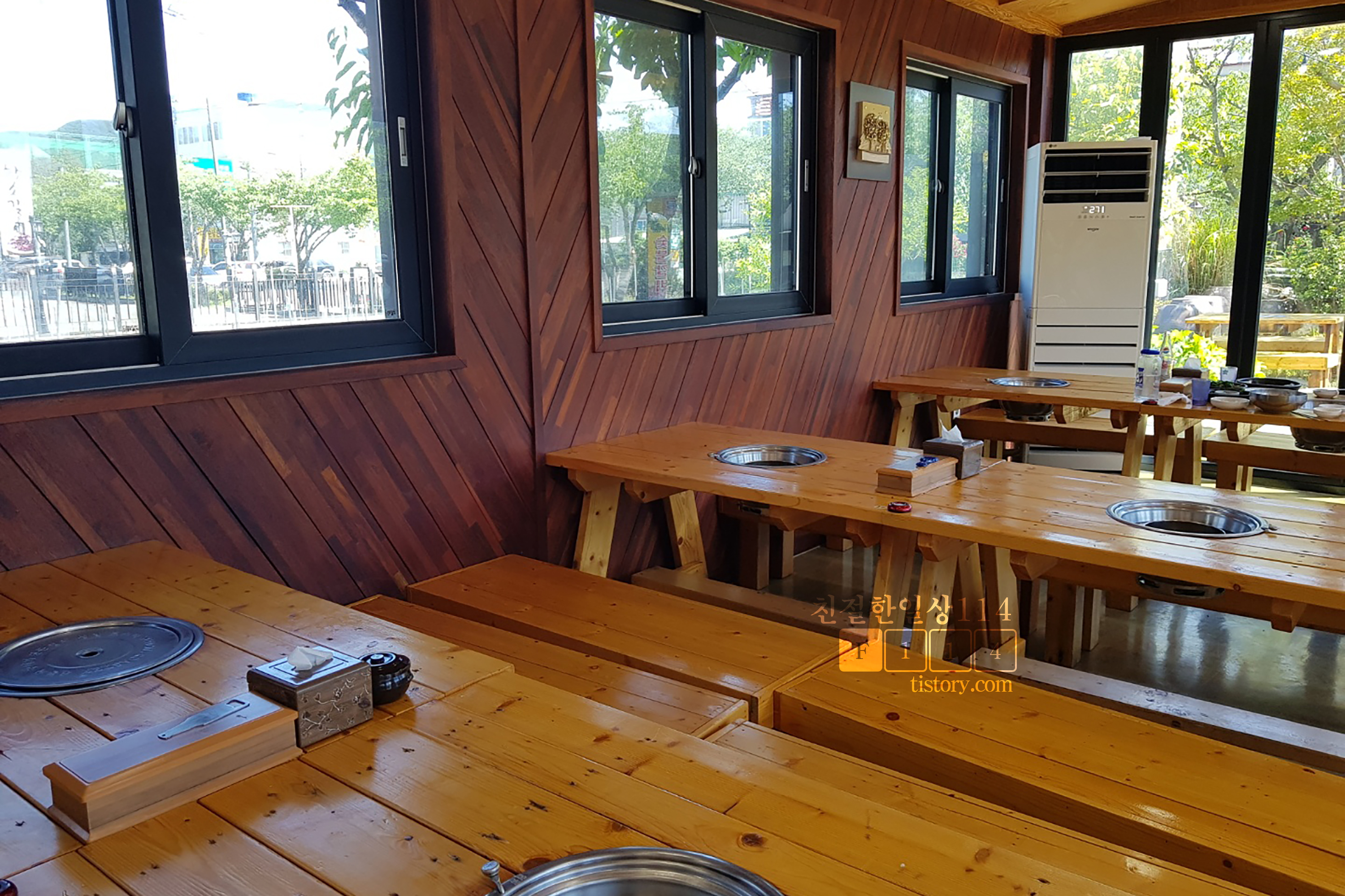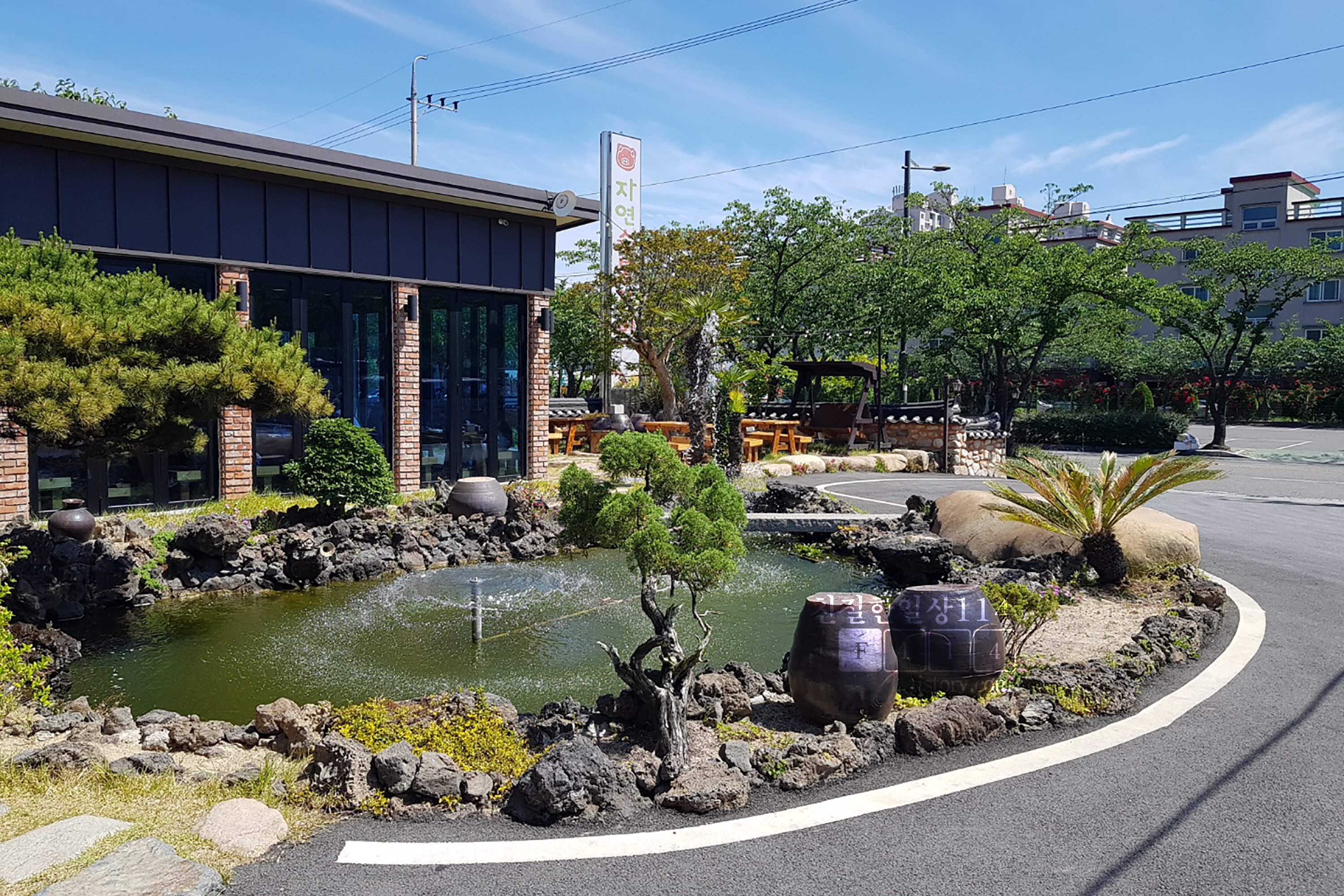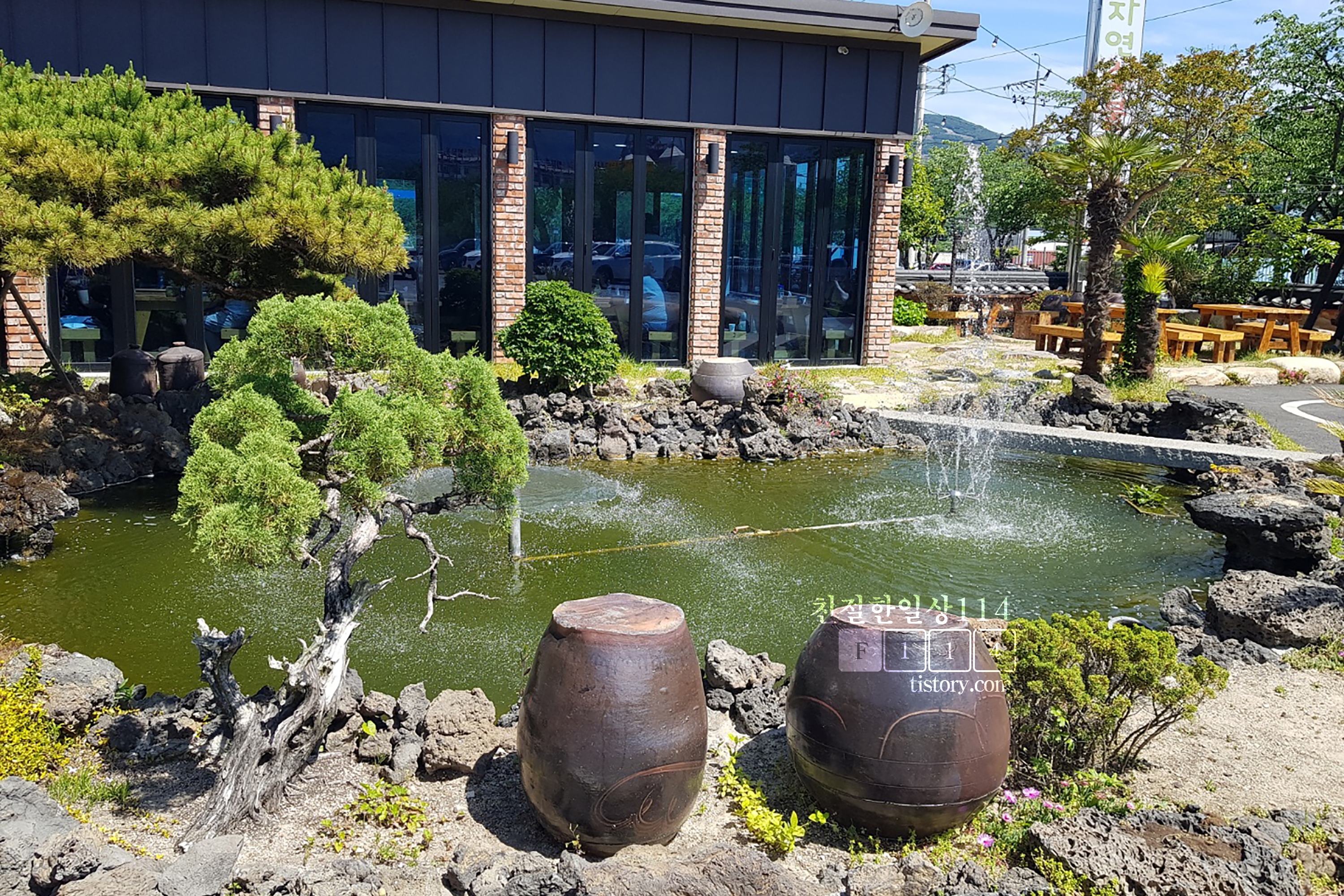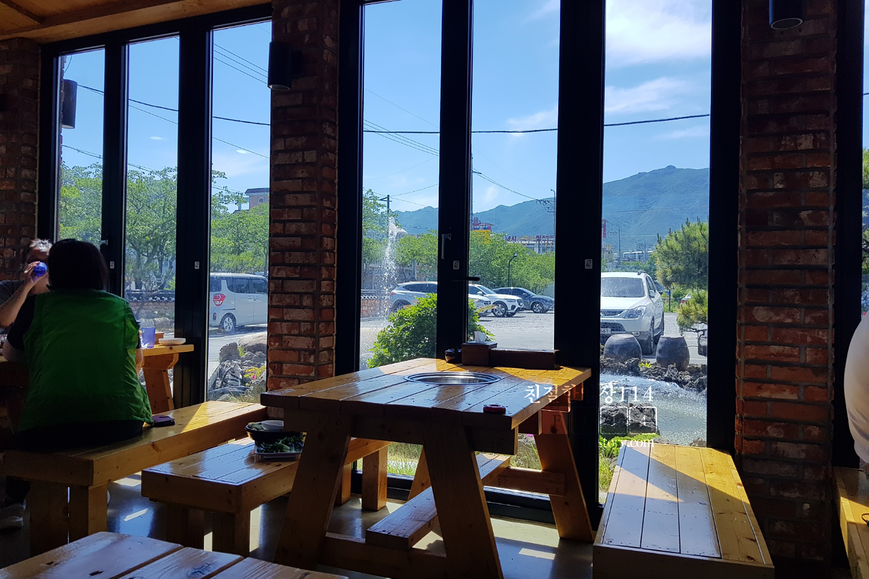 주차장과 연못이 보이는 창가쪽 테이블 자리.