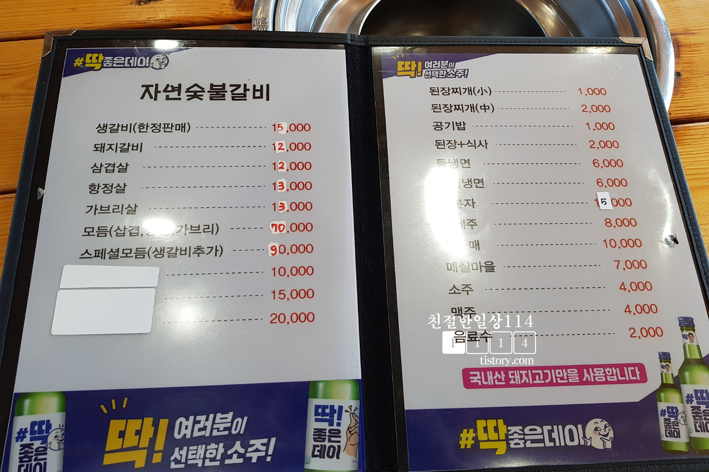 자리에 앉아 메뉴를 고민하고 있으니 직원분이 메뉴판을 가져다 준다. 사전에 봤던 가격이랑 다르다. 메뉴판에 가격을 지운 흔적이 있는 것으로 보아 최근에 가격 인상이 있었는가 보다. 2인분 주문하려고 했는데 최소 3인분부터 주문이 가능하다고 한다. 생갈비와 돼지갈비 차이점이 뭔지 물어보니 돼지갈비는 양념이 되어있다고 하며 생갈비는 비계가 많다고 한다. 생갈비가 한정판매라고 돼어있어 눈길을 끌어 생갈비로 3인분을 주무했다.