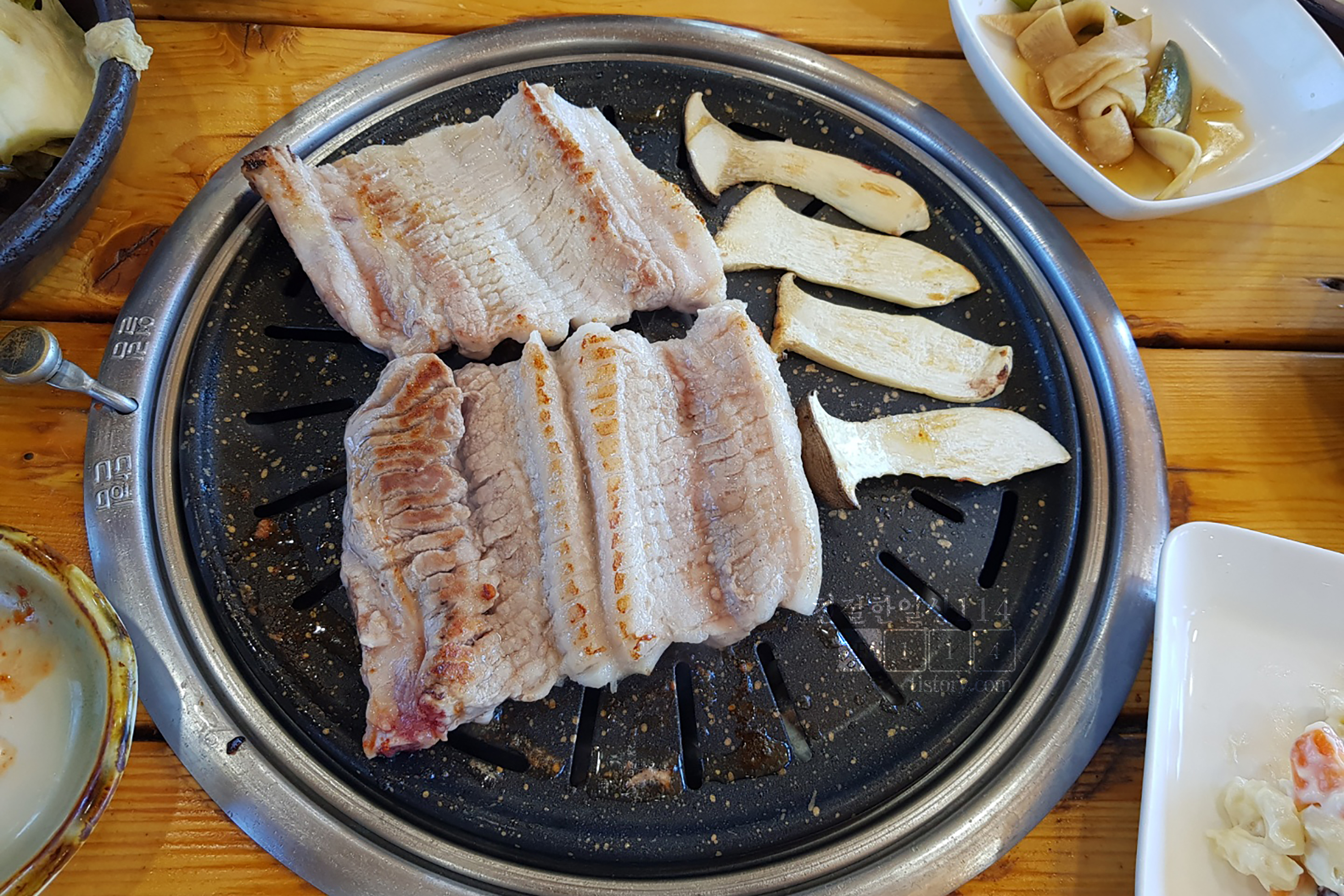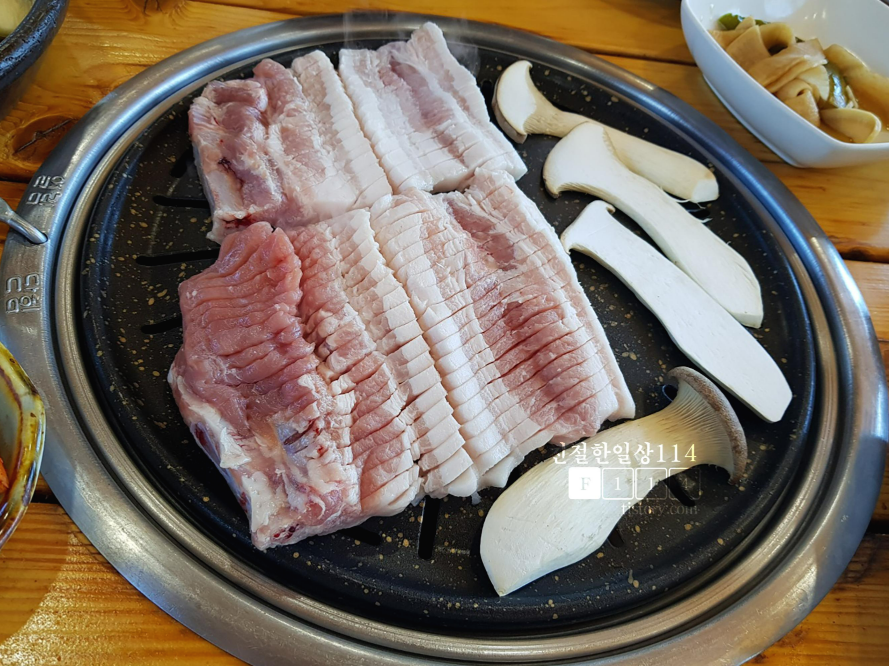 불판위에 2점을 올리니 자리가 없어서 나머지 자리에 버섯을 올린다. 이렇게 보니 비계가 반 이상이다. 우리보다 나중에 왔던 테이블에서도 생갈비를 주문했다가 비계가 많은것을 보고는 다른 메뉴로 바꾸는 것을 보았다. 현명한 선택이었는지도 모른다.