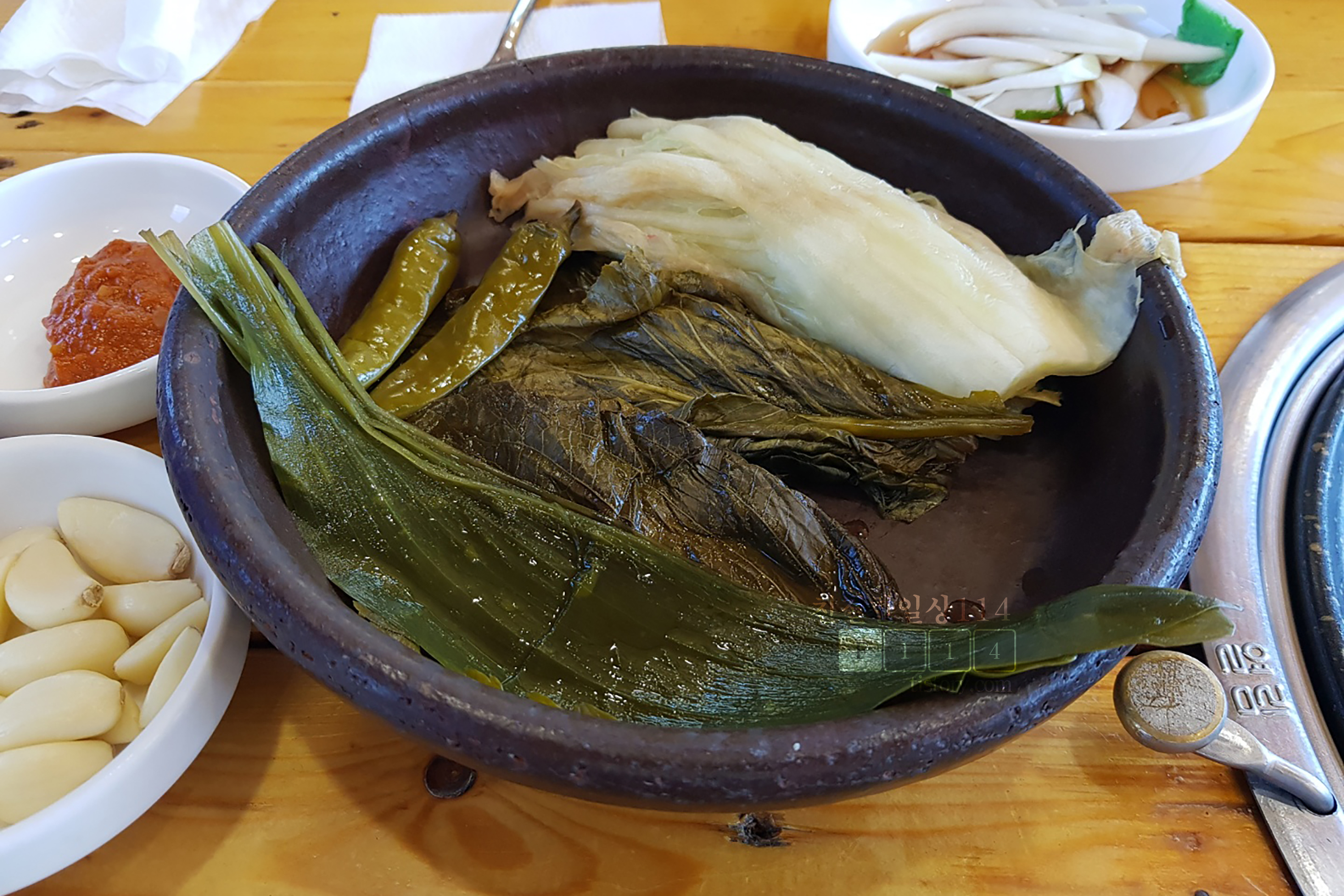 주차장에서 식당건물로 가다보면 화장실이 있다. 화장실 문이 활짝 열려있어서 남자 소변기는 밖에서 훤히 보인다. 조심히 볼일을 보고 손 씻는데 세정제 통이 비어있어서 물로만 씻고 나온다. 손으로 쌈을 싸먹어야하는 식당에서 손씻는 세정제가 떨어졌다는 점에서 많이 아쉬웠다.