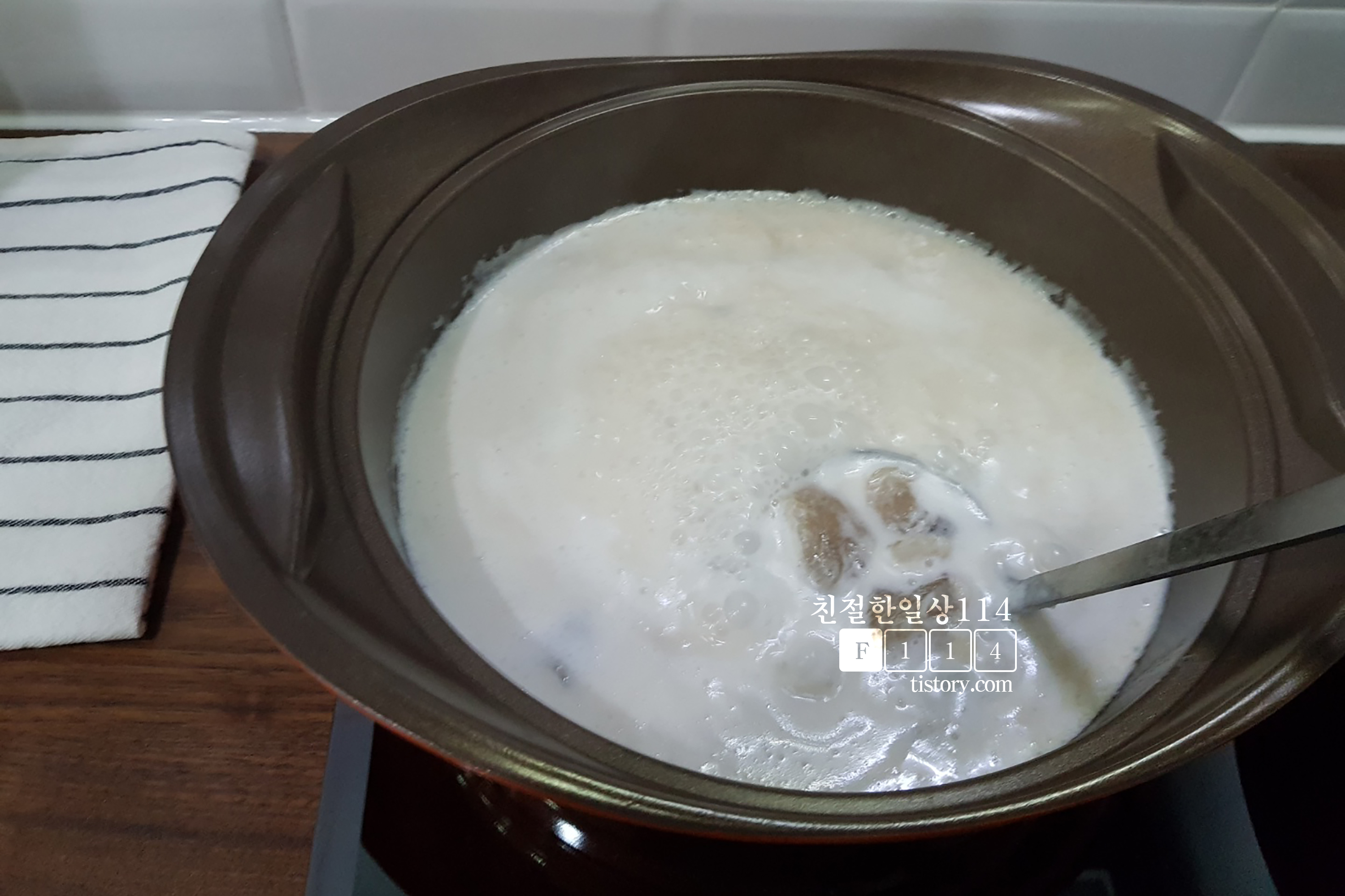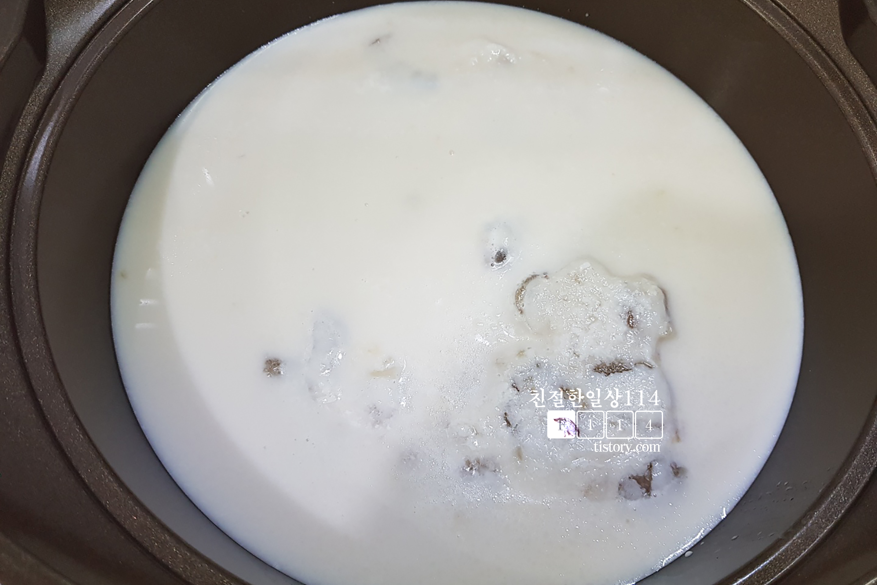 1. 해동 된 내용물을 냄비에 넣고 강한불에 4분간 끊인다.