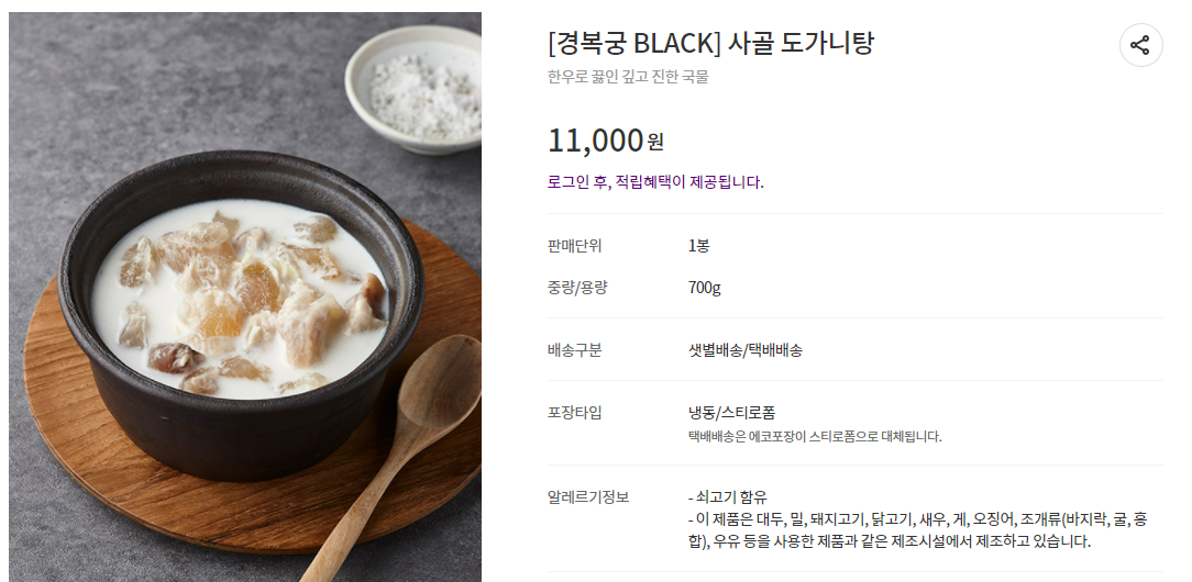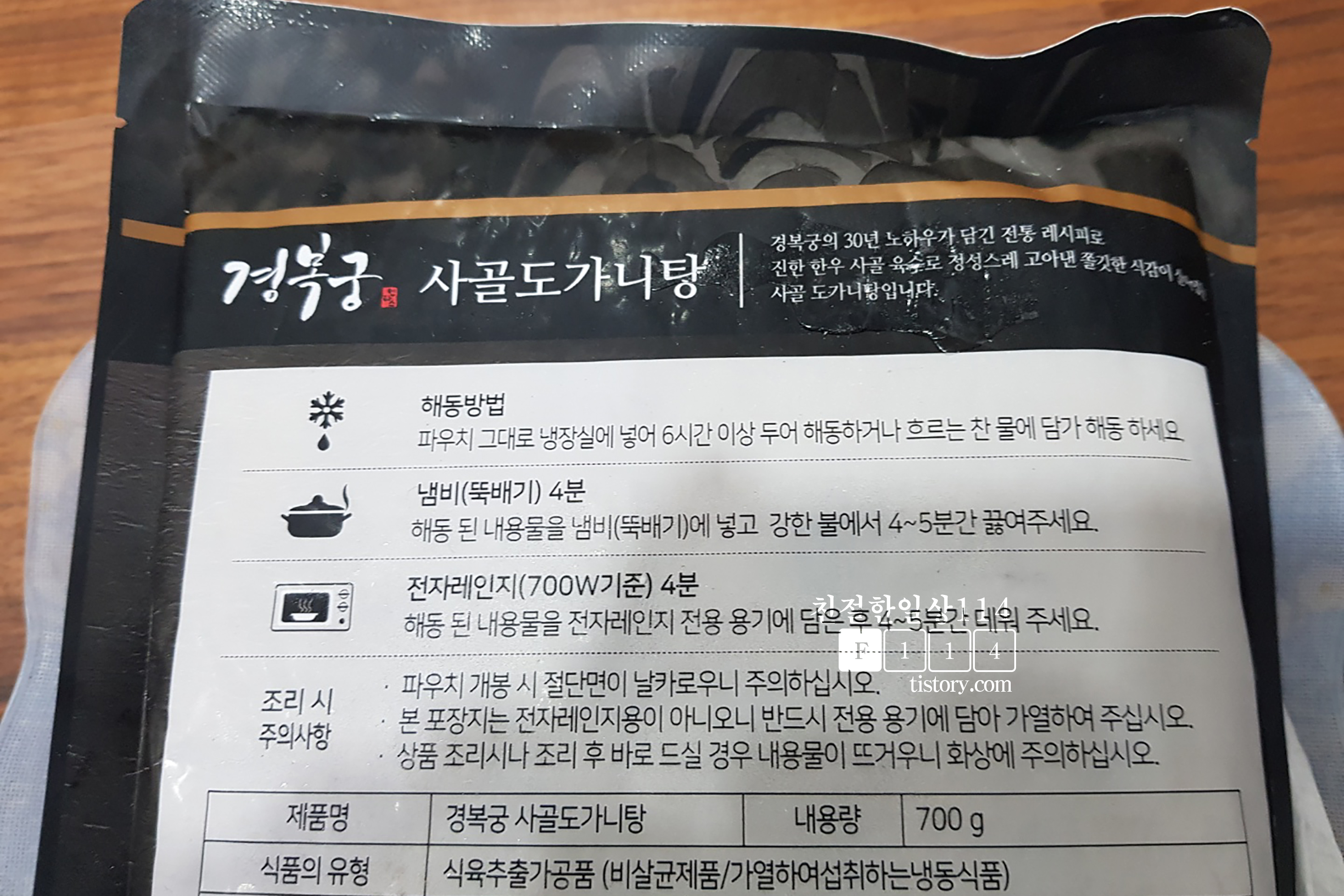 사골도가니탕을 식당에서 사먹으려면 저렴하게는 1만3천원부터 비싼곳은 1만9천원하는 곳도 있다. 100% 도가니를 쓰는 곳은 있는지 모를정도로 대부분 스지를 섞거나 스지만을 사용하는 것으로 알고 있다. 경복궁 사골도가니탕은 가격면에서 식당에서 사먹는것 보다 많이 저렴하다. 그리고 집에서 해동 후 끓여먹기만 하면 되니 간편해서 좋다. 1팩에 700g 으로 양으로 따지자면 식당에서 특대 1인분 정도 될 것 같다. 이번에는 1팩을 2명이서 나눠서 먹었고(먹는 양이 많지 않음을 참고) 부족하지 않은 양이었다. 사골국물의 진하기도 좋았고 가격도 괜찮은 사골도가니탕 재구매 의향 있음을 알리며 글을 마친다.