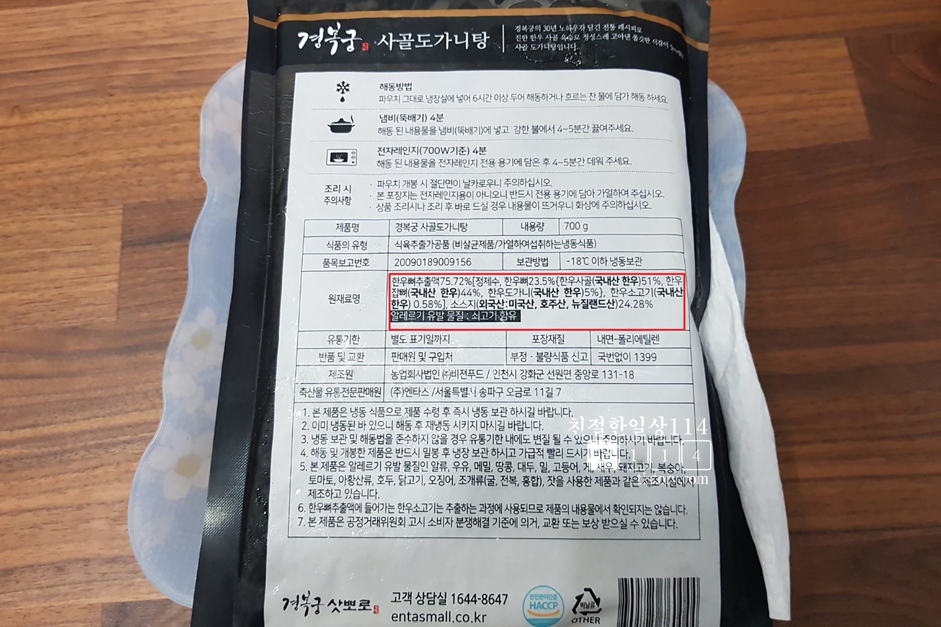 한우뼈, 한우사골, 한우잡뼈, 한우도가니. 한우소고기, 소스지가 들어가있다. 이중 국물은 한우에서 우려낸것이며 고기는 도가니(한우) 5%, 소스지(외국산: 미국,호주,뉴질랜드) 24.28% 들어있다. 한우도가니는 소량들어있고 대부분이 소스지로 외국산이다.