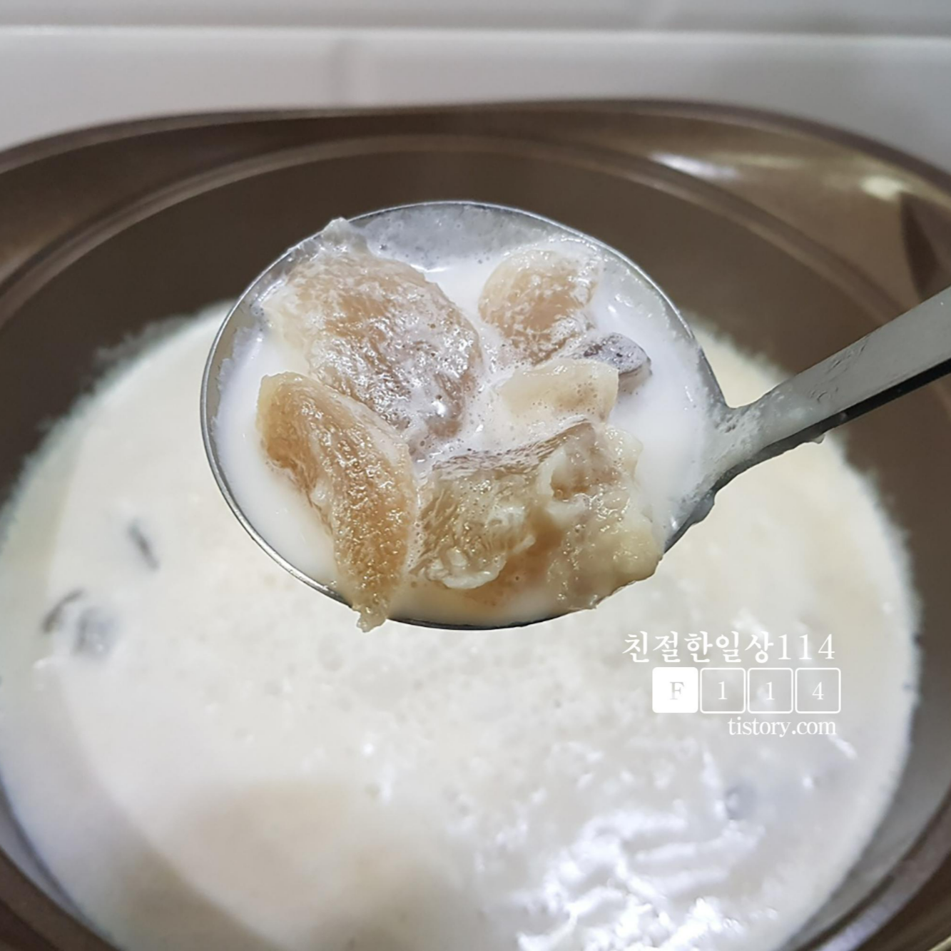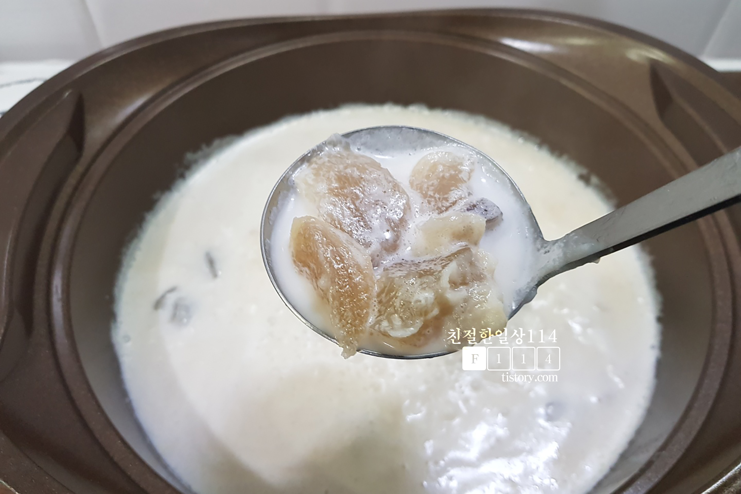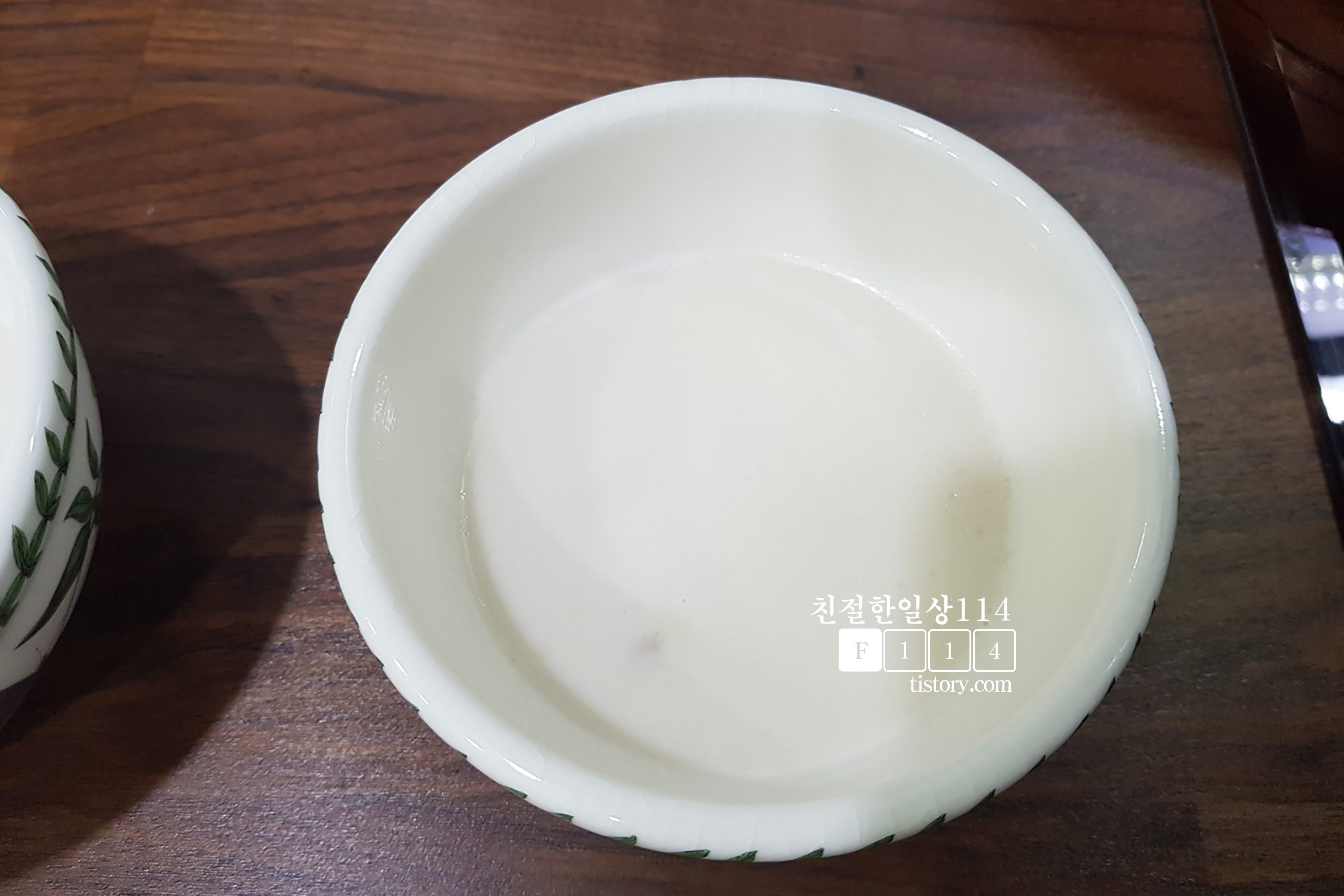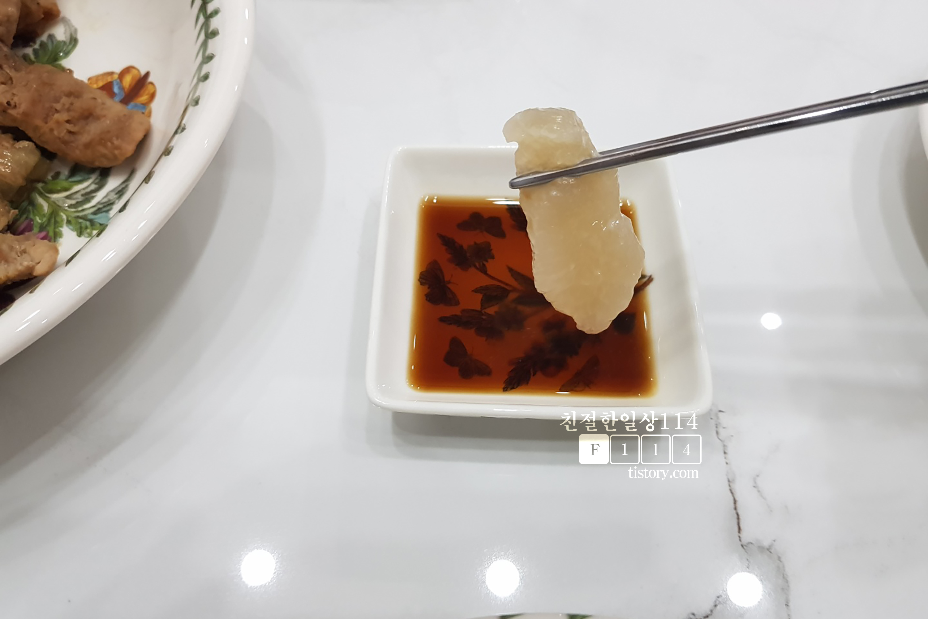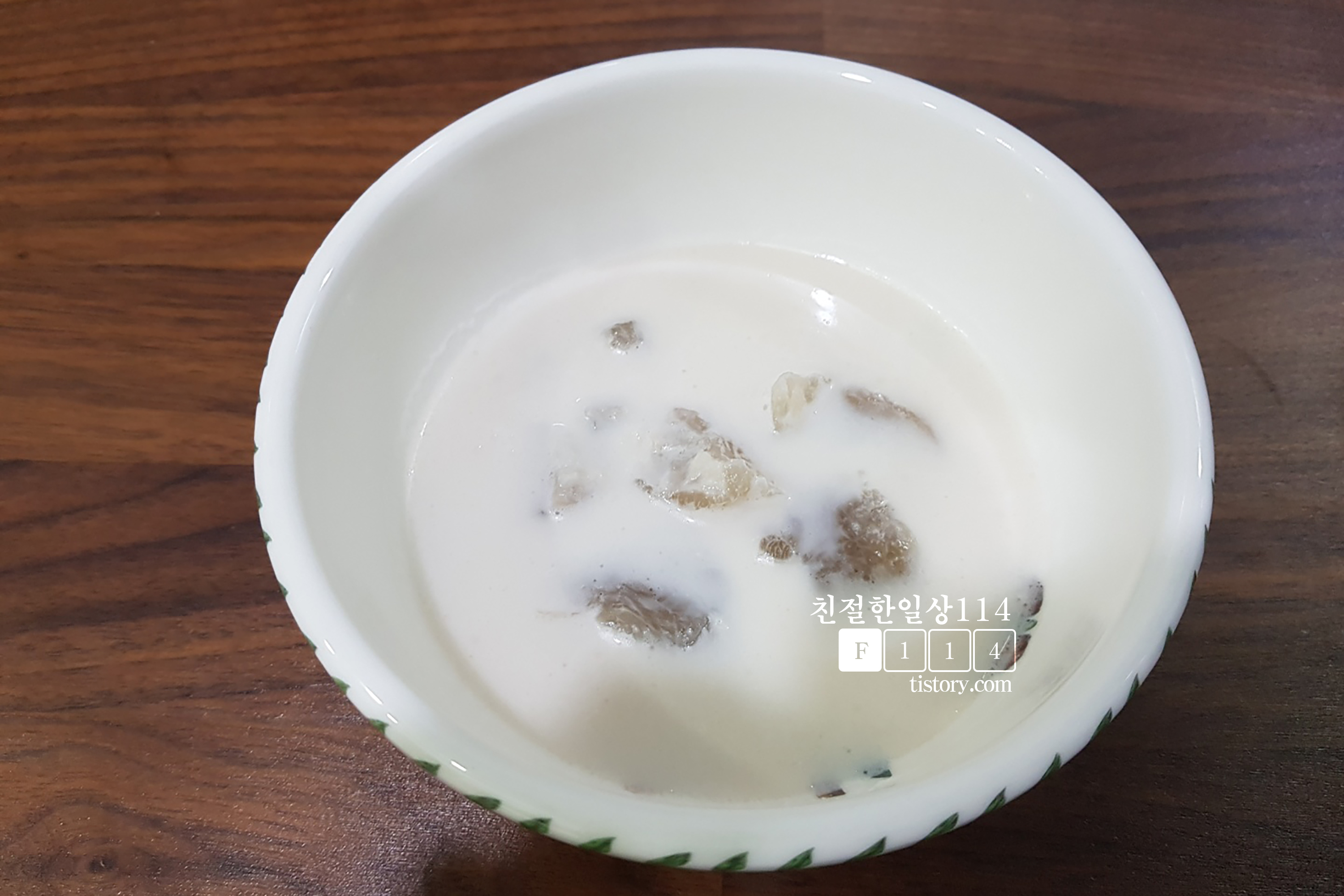 이렇게 결이없고 흐믈한 것은 도가니이다. 결이있으며 탱글한 식감이 느껴지는 것은 스지다. 도가니를 간장에 찍어서 맛봐가며 도가니탕을 즐긴다.