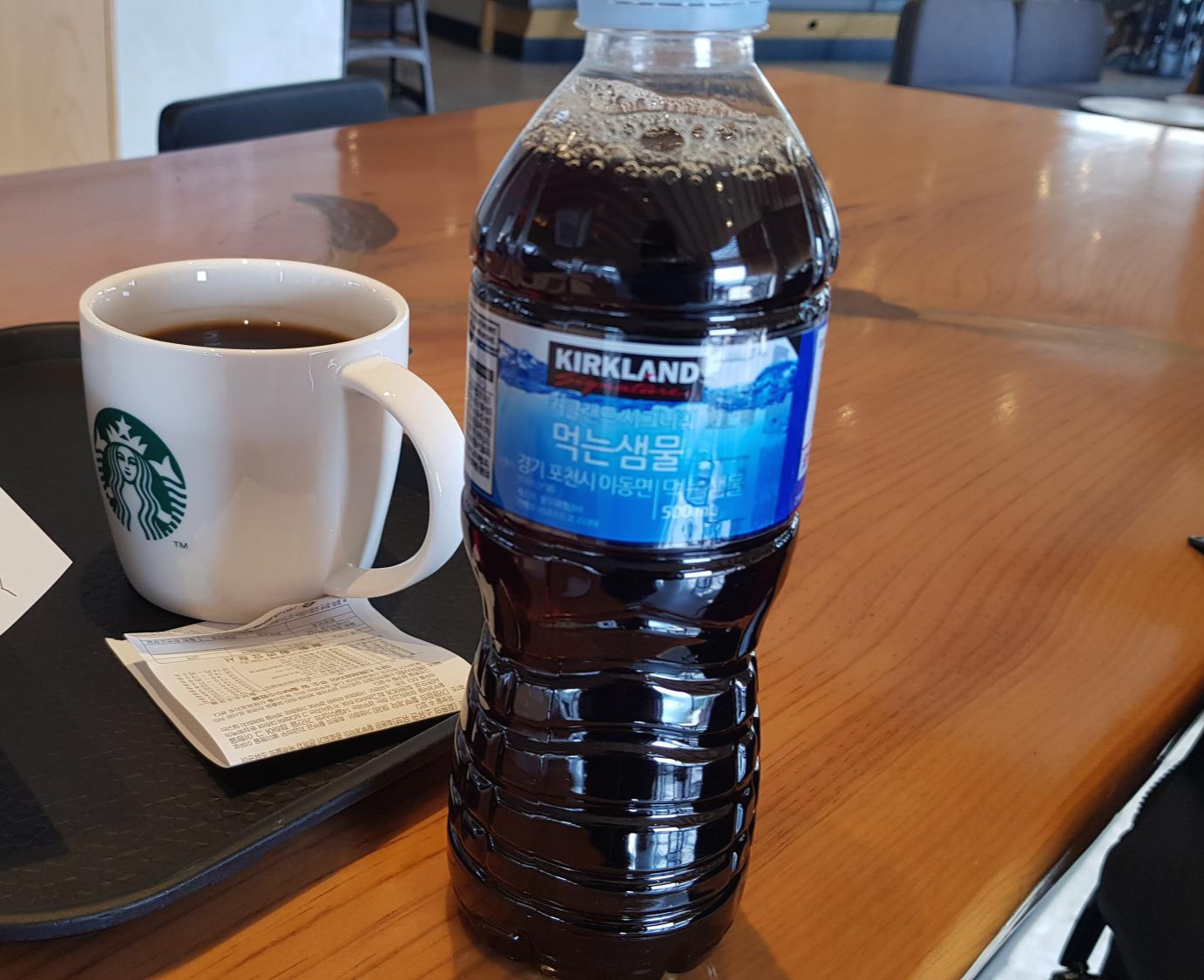 외출할때는 페트병에 있는 물을 조금 마신 후 더치커피를 페트병에 넣어서 가지고 나온다. 스벅에서 사진을 찍기위해서 잠시 꺼내보았다.