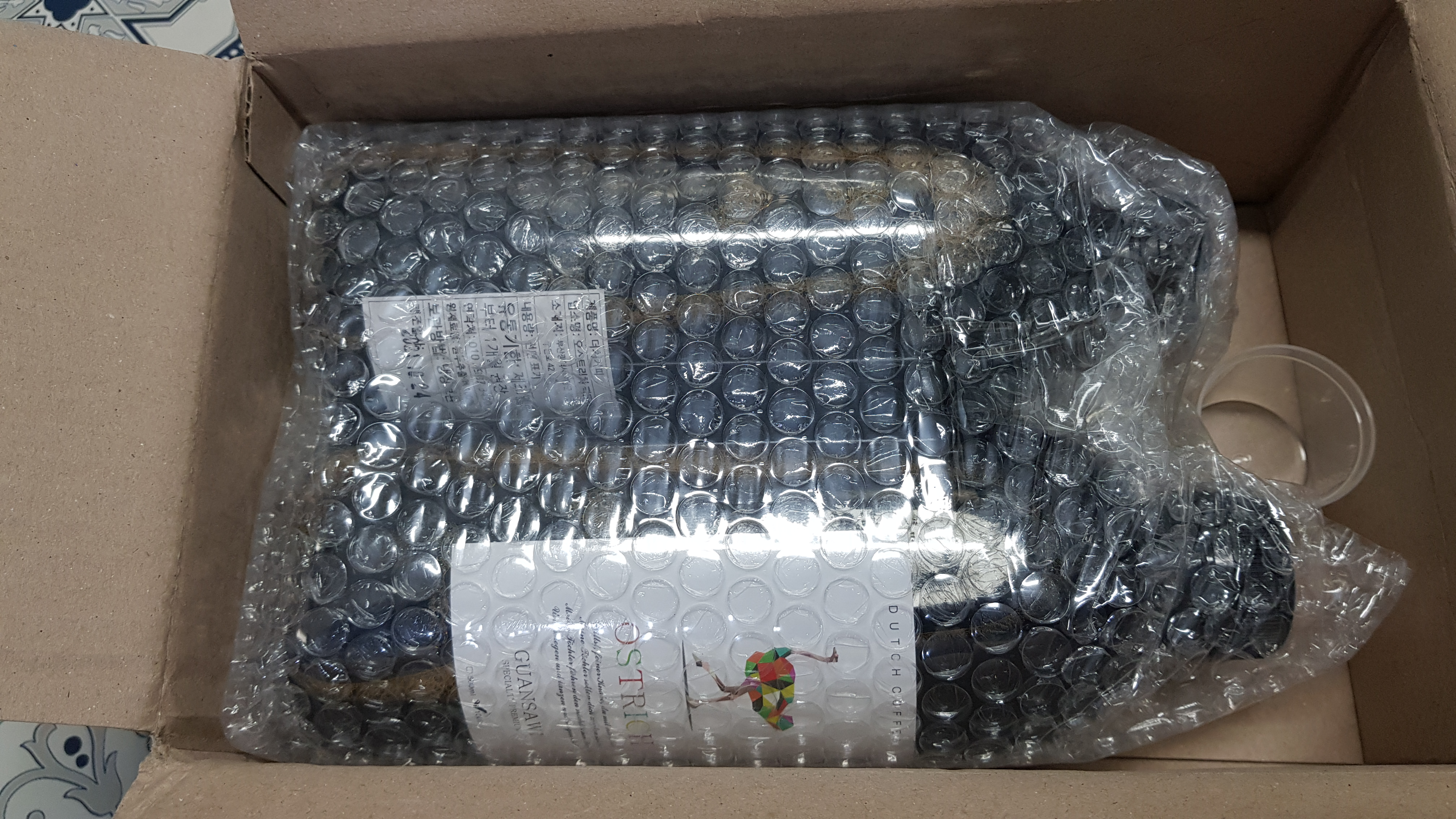 커피는 플라스틱 병에 담겨있지만 포장은 뾱뾱이로 안전하게 해준다.