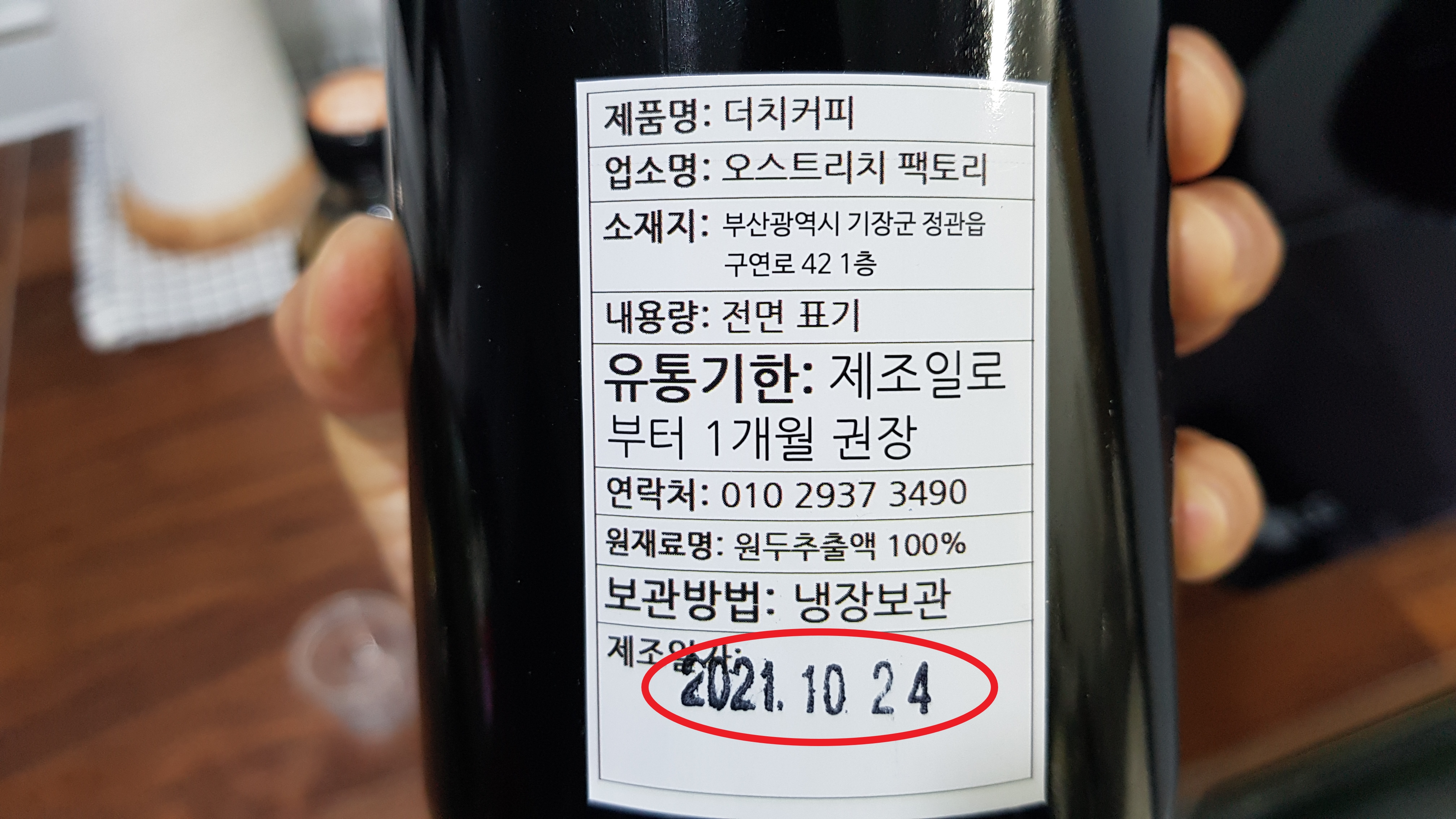 오스트리치 팩토리 커피는 주문하면 당일 제조하여 배송해준다. 이번 4번째 주문은 10월 24일에 했으며 배송해서 집에 도착한건 10월 26일이었다. 병에 표기된 제조날짜는 보니 주문했던 10월 24일로 찍혀있다.