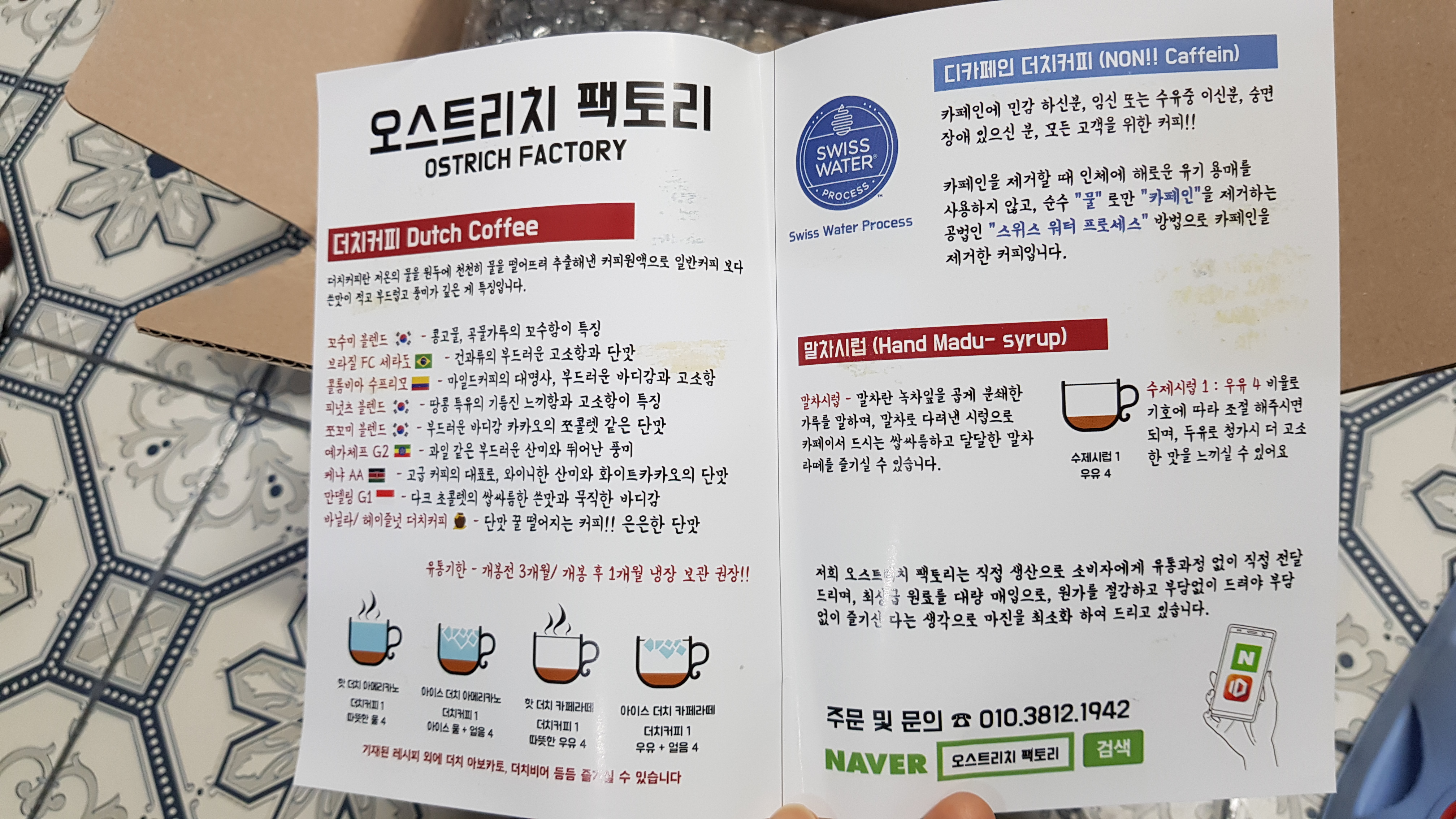 오스트리치 팩토리 더치커피 설명서. 설명에서 보면 디카페인 더치커피도 있다. 아내는 카페인에 민감해서 디카페인 커피를 마시고 있다. 필자는 저녁에 커피를 마셔도 잘 자기에 하루 2~3잔은 마시는 중이다.