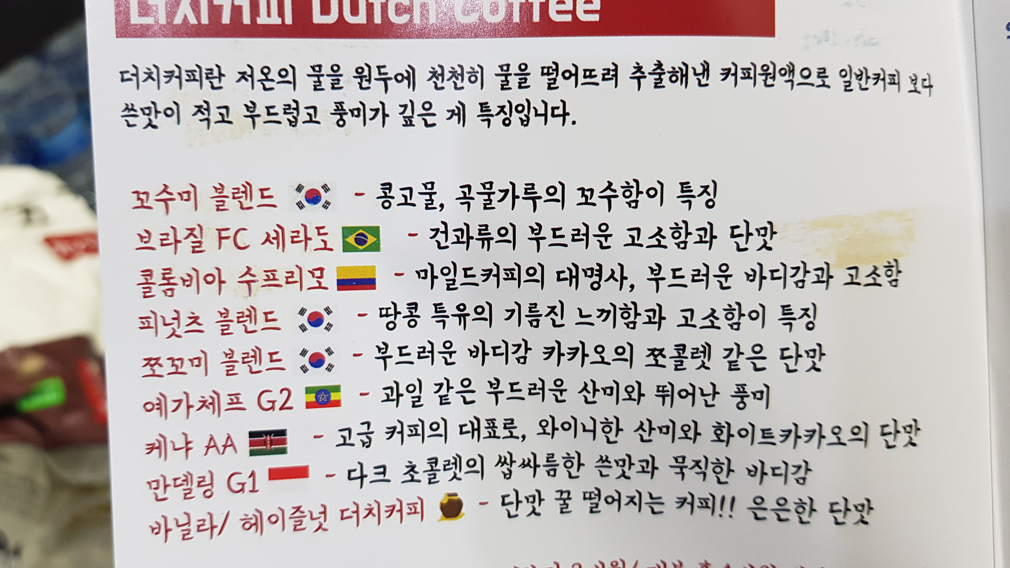 - 바닐라/헤이즐넛 더치커피: 단맛 꿀 떨어지는 커피. 은은한 단맛
