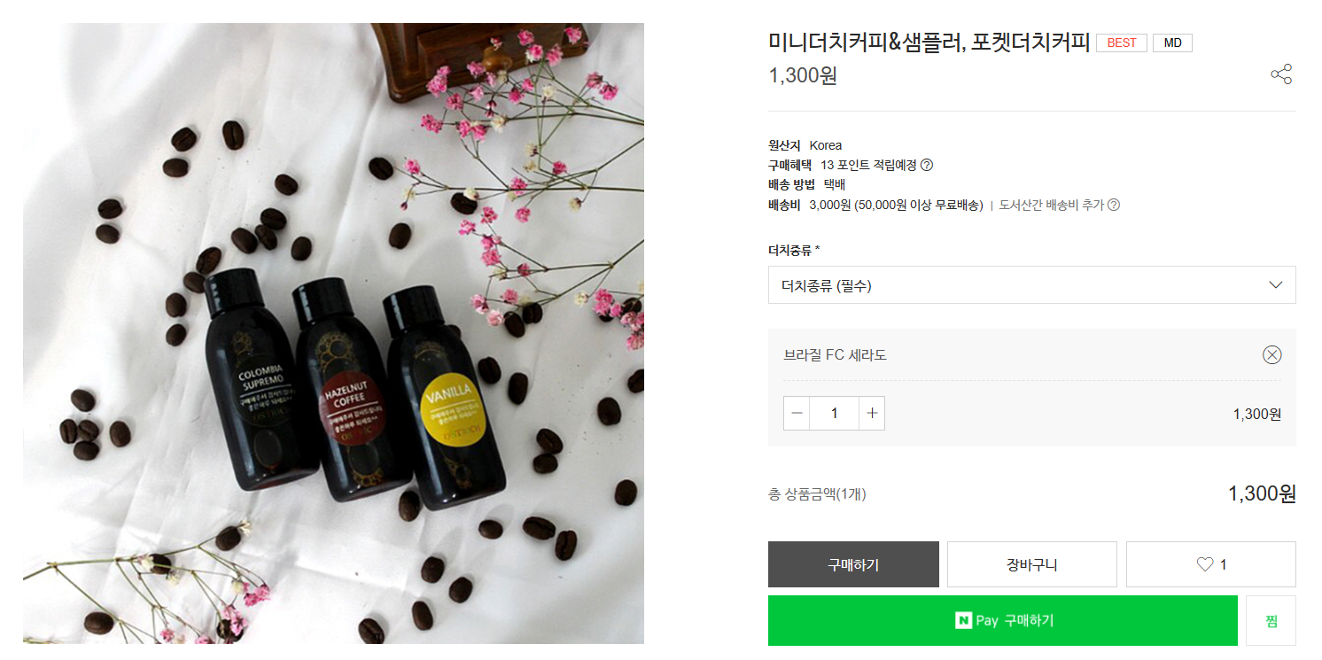작은용량의 미니더치는 외출용으로 가지고 다니기 편할것 같다. 그리고 주문시 원하는 문구나 스티커를 제작해서 준다고 하니 편하기도 하고 선물용이나 답례품으로 좋을것 같다. 미니더치커피&샘플러 가격은 1,300원이며 배송비는 3,000원이 붙는다. 단 50,000원 이상 구매하면 무료배송이 가능하다고 한다.