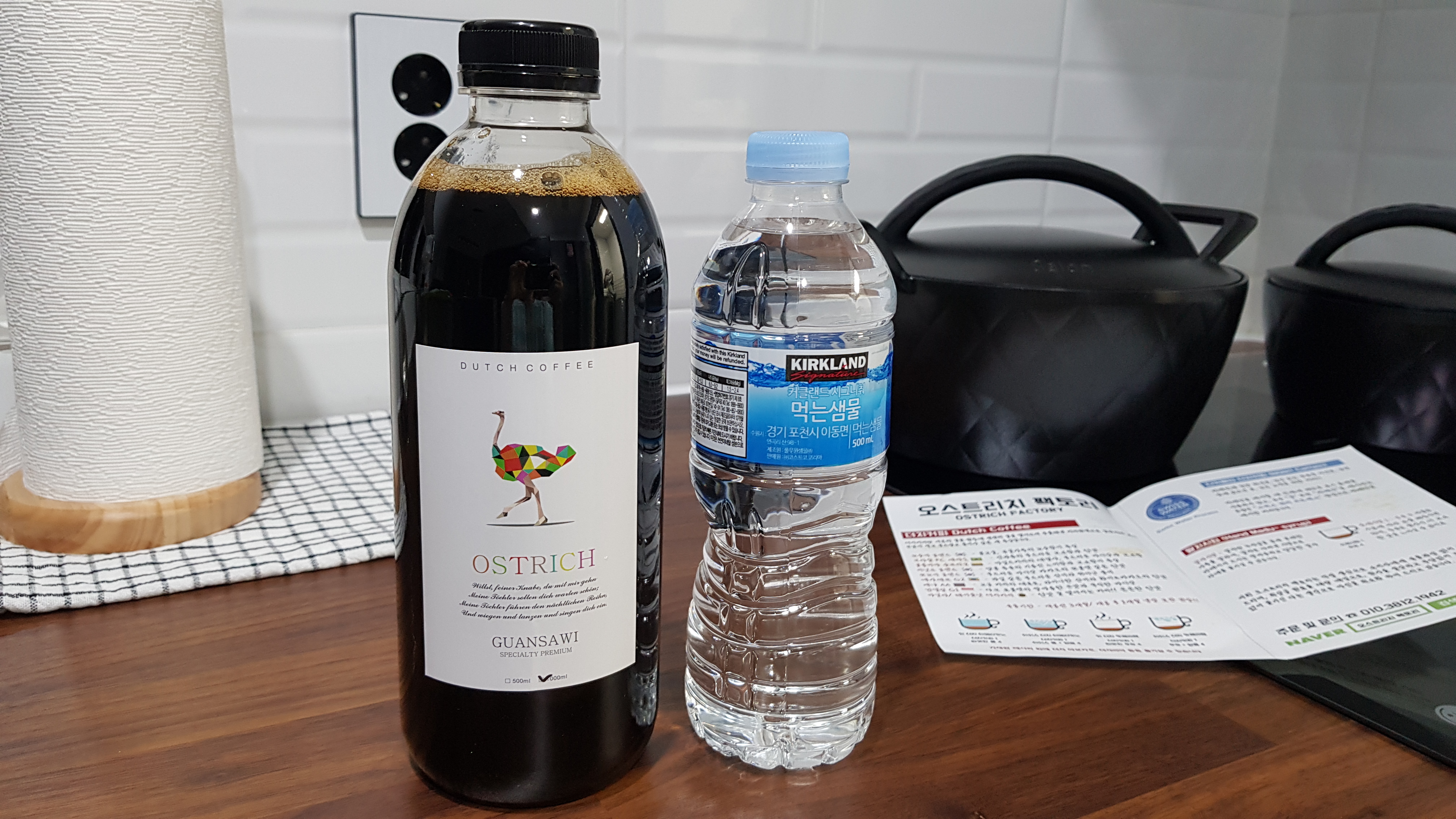오스트리치 팩토리 더치커피 설명서. 설명에서 보면 디카페인 더치커피도 있다. 아내는 카페인에 민감해서 디카페인 커피를 마시고 있다. 필자는 저녁에 커피를 마셔도 잘 자기에 하루 2~3잔은 마시는 중이다.