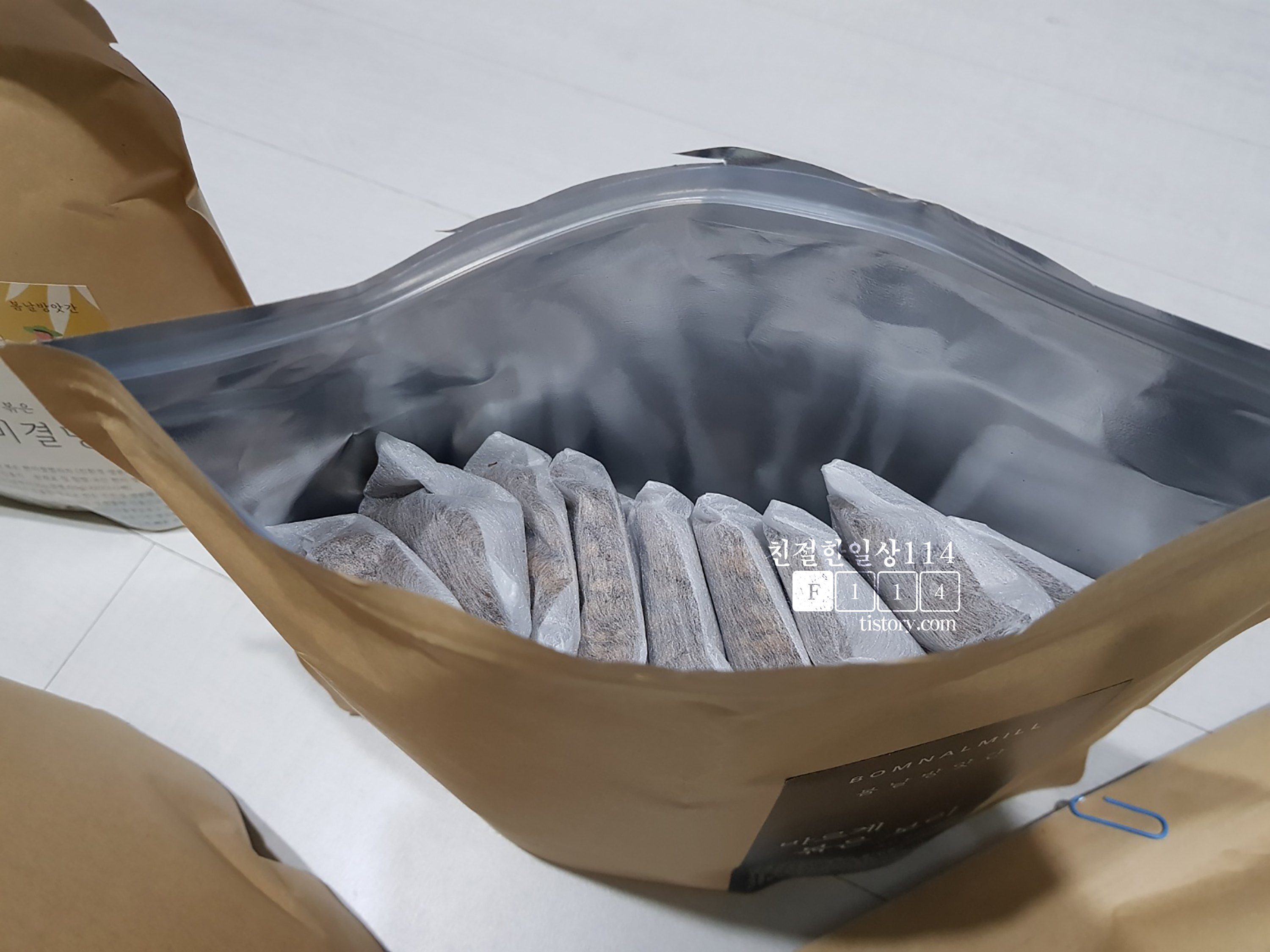 인터넷에서 검색해보다 홈페이지 들어가서 보니 봄날방앗간에서는 100% 우리곡물로 만든다는 점과 티백(다시백)이 옥수수 전분에서 추출한 원료로 만든 친환경 생분해 제품이라고 하는 점에서 마음에 들었다.